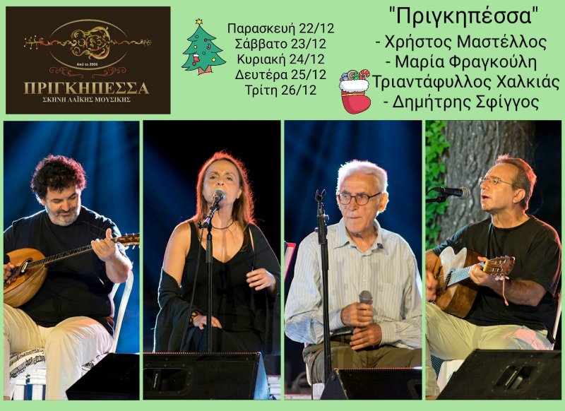 – Παρασκευή 22, Σάββατο 23, Κυριακή 24, Δευτέρα 25 και Τρίτη 26 Δεκεμβρίου. Ρεμπέτικα και λαϊκά τραγούδια • Χρήστος Μαστέλλος φωνή • Μαρία Φραγκούλη φωνή • Τριαντάφυλλος Χαλκιάς μπουζούκι φωνή • Δημήτρης Σφίγγος κιθάρα, φωνή.