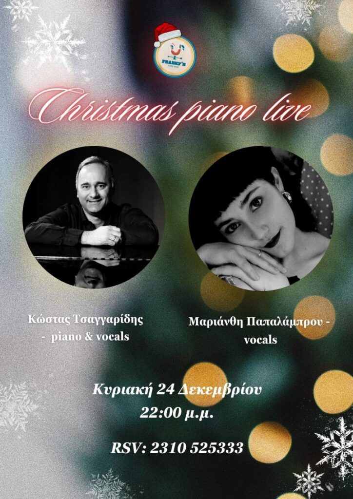 To Franky’s Funky Wine Bar σε υποδέχεται την Παραμονή Χριστουγέννων με ένα Christmas Piano Live. Ο αγαπημένος πιανίστας Κώστας Τσαγγαρίδης, παρέα με τη μελωδική φωνή της Μαριάνθης Παπαλάμπρου, θα σε διασκεδάσουν με τις μουσικές επιλογές τους, σε ένα θερμό και φιλικό Χριστουγεννιάτικο κλίμα! ✨ Πραγματοποιήστε την κράτησή σου έγκαιρα: RSV: +30 2310525333 *Κυριακή 24 Δεκεμβρίου, στις 22:00, στο Franky’s Funky Wine, Διαμαντή Ολυμπίου 16