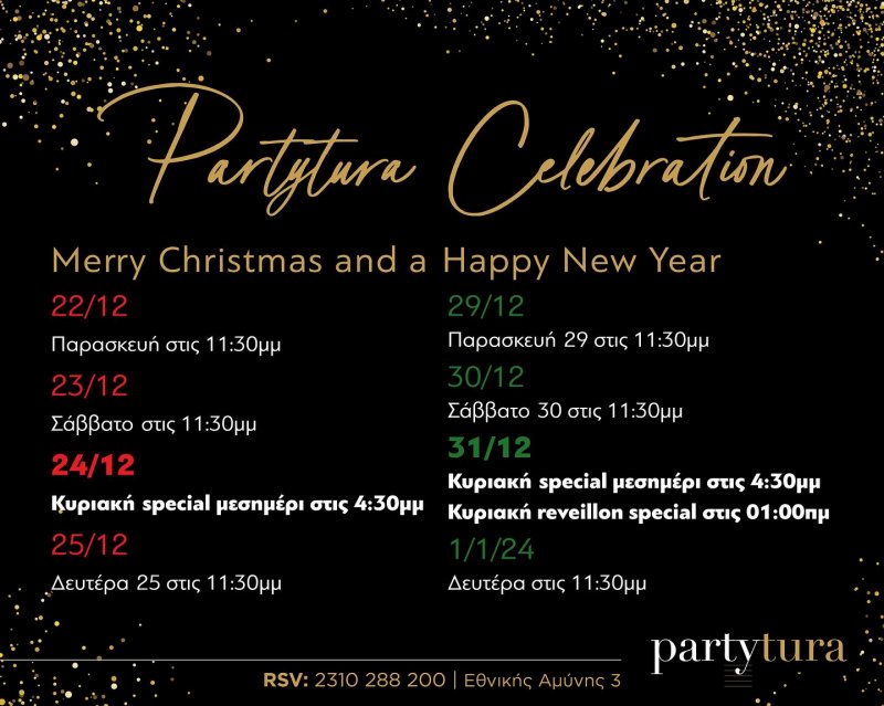 Προγράμματα που τιμούν το καλό ελληνικό τραγούδι και τους δημιουργούς του, αλλά αναδεικνύουν και τη μουσική αξία της εποχής, ταλαντούχες, νέες φωνές της πόλης κι ένα συνονθύλευμα θαμώνων, κάνουν τα πάρτι της Partytura μοναδικά. Ζήσε καθόλη τη διάρκεια των γιορτών μοναδικές βραδιές που έχουν την αίσθηση της παρέας, του ωραίου χαβαλέ, της γλυκιάς νοσταλγίας και του αληθινού γλεντιού.