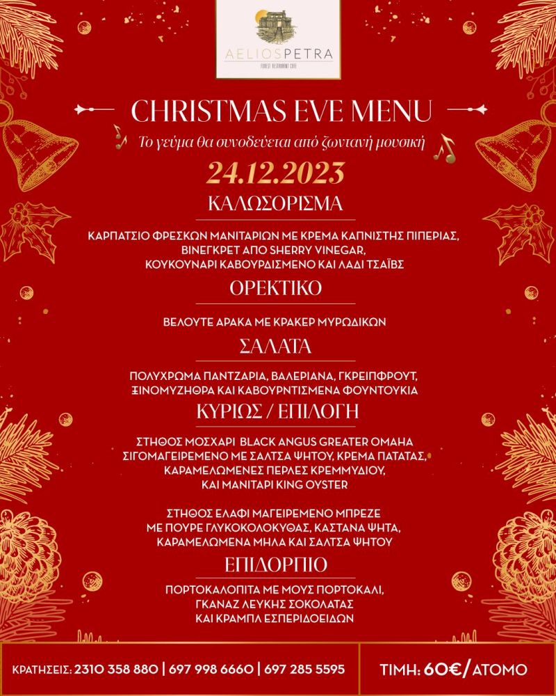 Το Aelios Petra υπόσχεται γιορτές με καλό φαγητό, καλή μουσική και την θερμότερη εορταστική ατμόσφαιρα, πάντα με την απερίγραπτη θέα. Ενα εξαιρετικό μενού σε περιμένει για την Παραμονή των Χριστουγέννων.