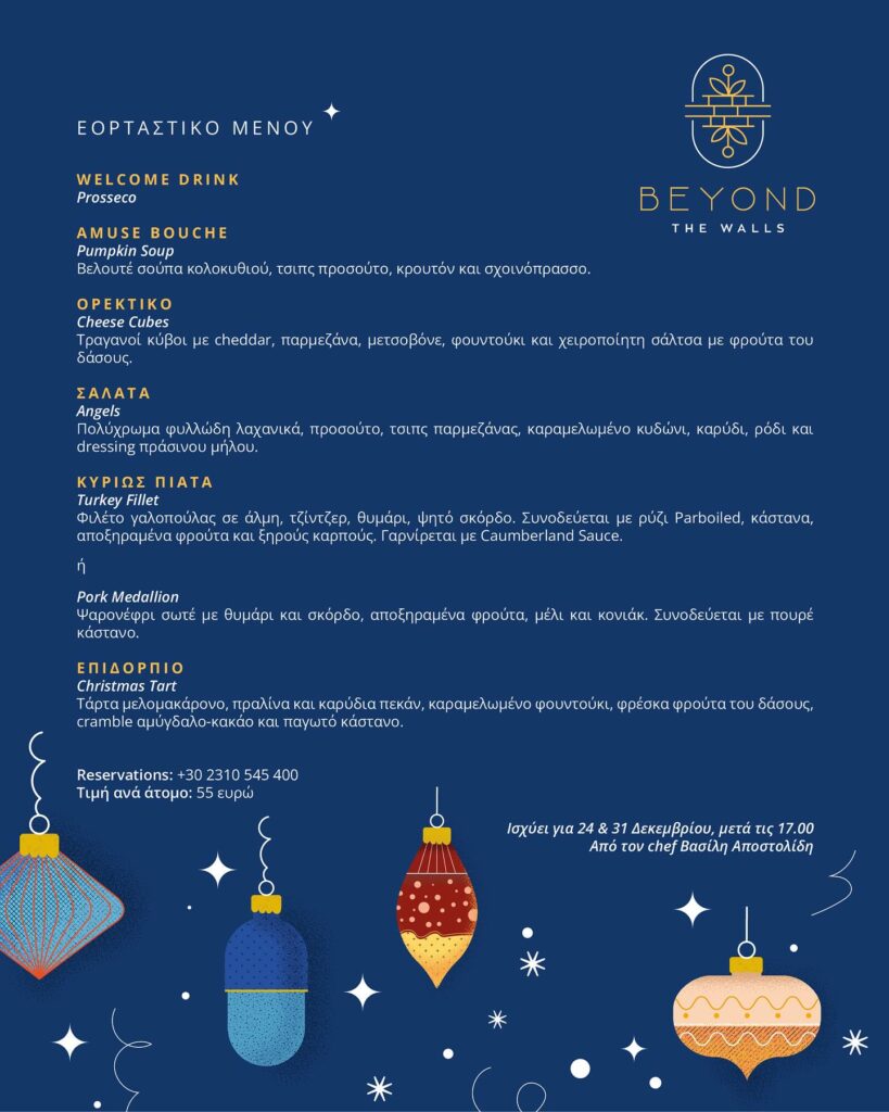 *Παραμονή Χριστουγέννων & Πρωτοχρονιάς. μετά τις 19.00, στο Beyond The Walls, Φράγκων 2, Τ. 2310 545400.