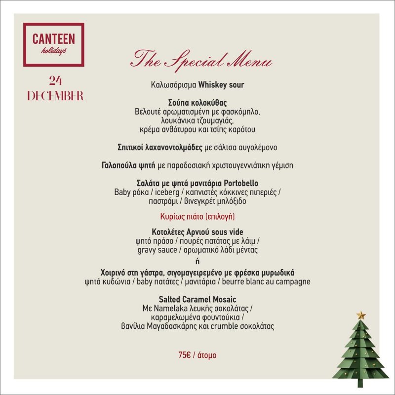 Γιόρτασε την παραμονή των Χριστουγέννων στο Canteen και απόλαυσε ένα σπέσιαλ μενού επτά πιάτων που έχει ετοιμάσει για σένα.