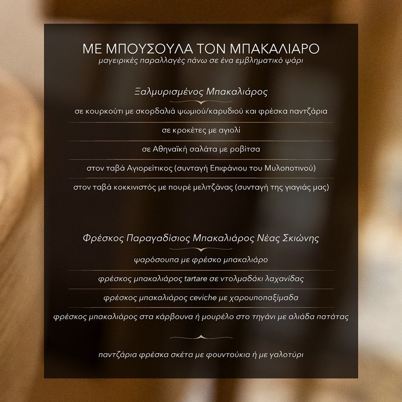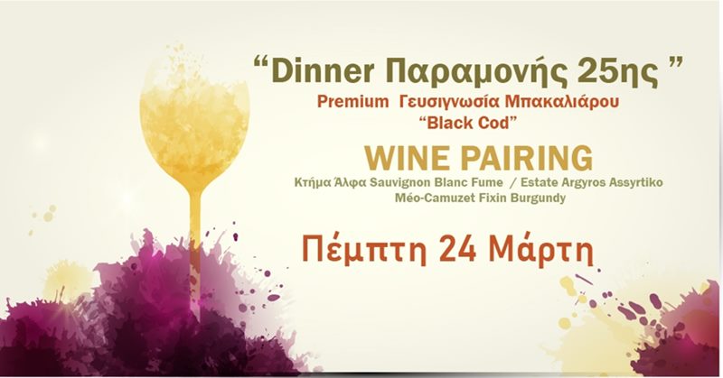 Ένα από τα αγαπημένα γαστρονομικά ελληνικά έθιμα είναι ο μπακαλιάρος την 25η Μαρτίου. Το Thria τιμά την γαστρονομική παράδοση την παραμονή της γιορτής, με ένα dinner αφιερωμένο στον μπακαλιάρο σε διαφορετικές εκδοχές.
