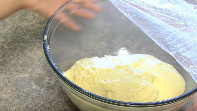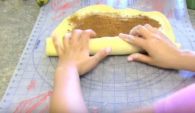 Πιάνουμε τη ζύμη από το πάνω άκρο της, κι αρχίζουμε σιγά-σιγά να την τυλίγουμε σε ρολό, πιέζοντας μαλακά, μέχρι να γίνει σαν μακρύ σαλάμι. Όταν φτάσουμε κοντά στο τέλος, βρέχουμε λίγο την άκρη της ζύμης για να κολλήσει. Κόβουμε τη ζύμη μας σε ισομεγέθη κομμάτια και τα τοποθετούμε ξαπλωτά σε βουτυρωμένο ταψί.