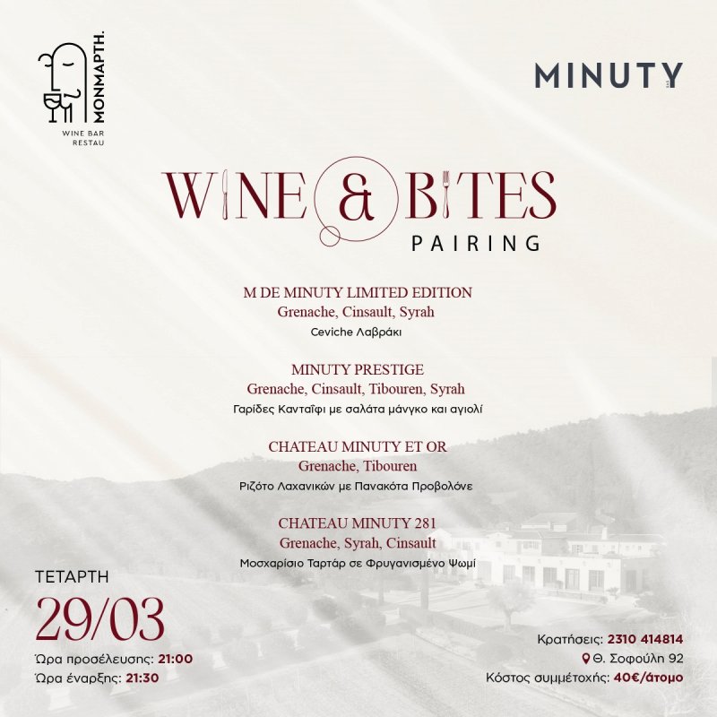 Αύριο Τετάρτη η Μονμάρτη φιλοξενεί το φημισμένο γαλλικό οινοποιείο Minuty, που διαθετει πάνω από 85 χρόνια εμπειρίας στην παραγωγή κρασιών και σε προσκαλεί να δοκιμάσεις τέσσερις από τις πιο γνωστές ετικέτες κρασιών του οινοποιείου, που θα συνοδέψουν ένα ολοκληρωμένο ταξίδι γεύσεων φτιαγμένο ειδικά για αυτή την ημέρα.