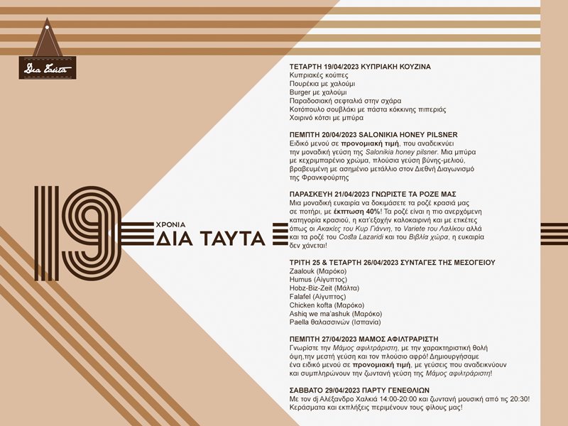 Έναν χρόνο μετά την ενηλικίωσή του, το Δια Ταύτα μας προσκαλεί στα γενέθλιά του, σε μια εβδομάδα γεμάτη μεσογειακές γαστρονομικές εκπλήξεις και φινάλε μ’ ένα ανεπανάληπτο πάρτι!