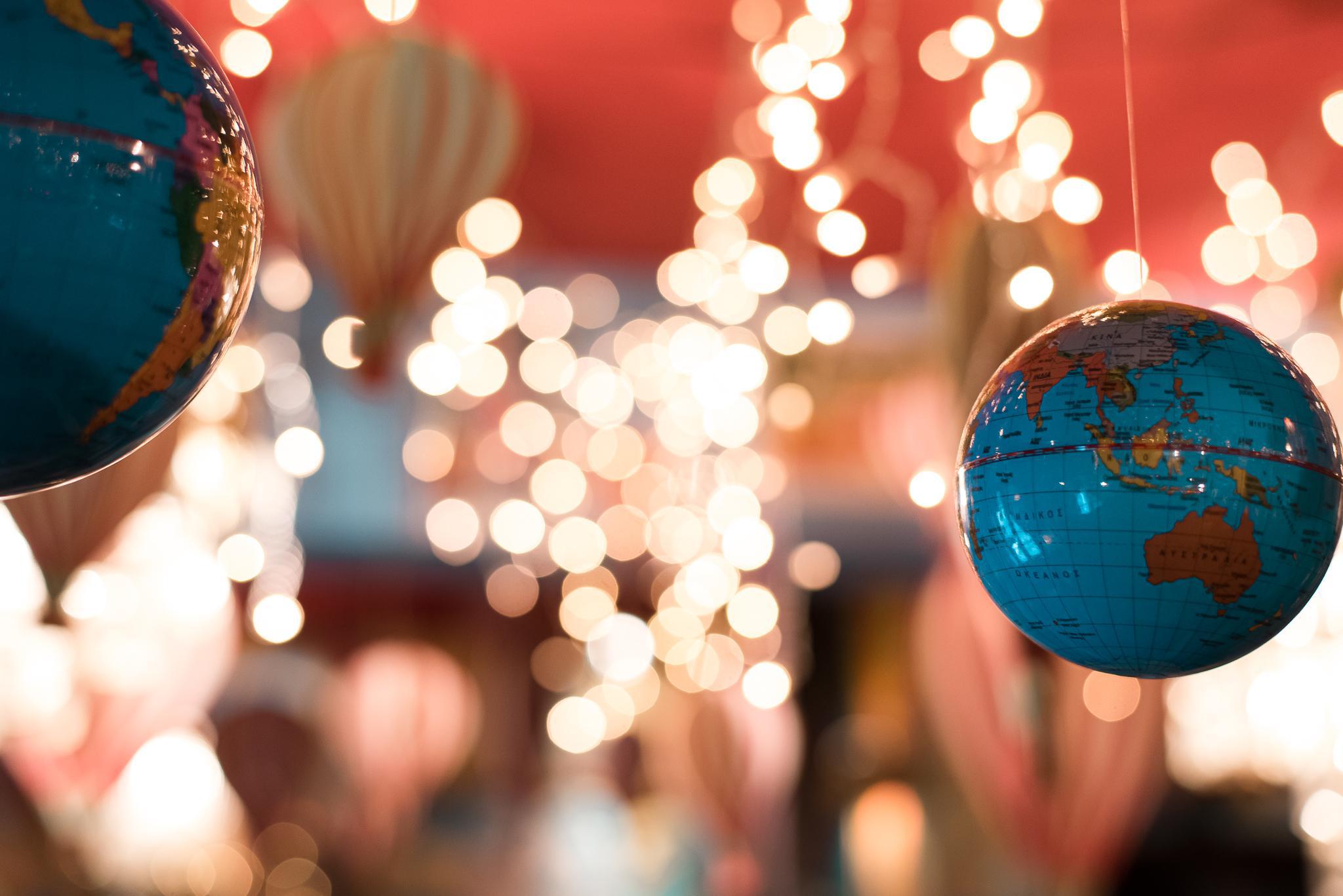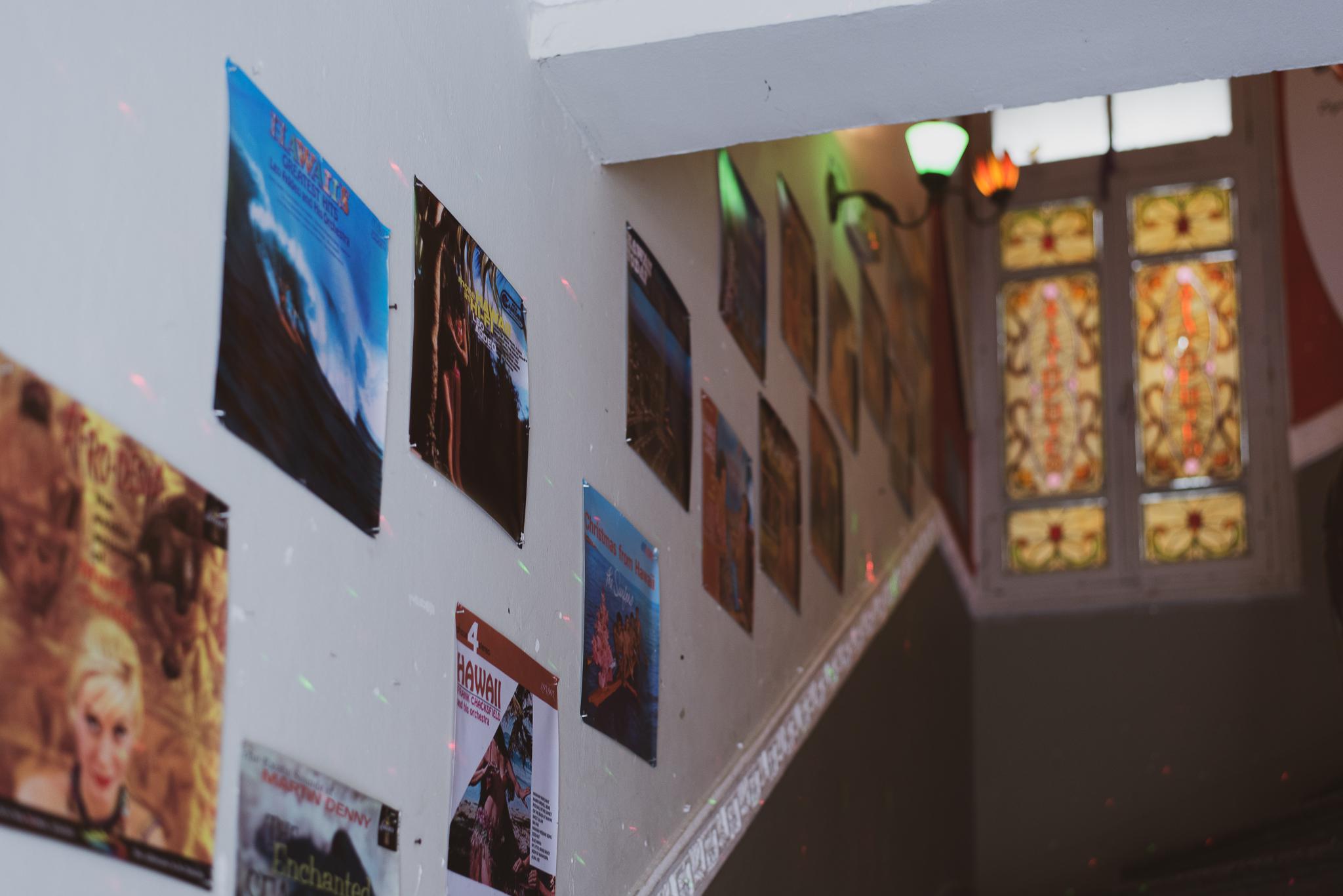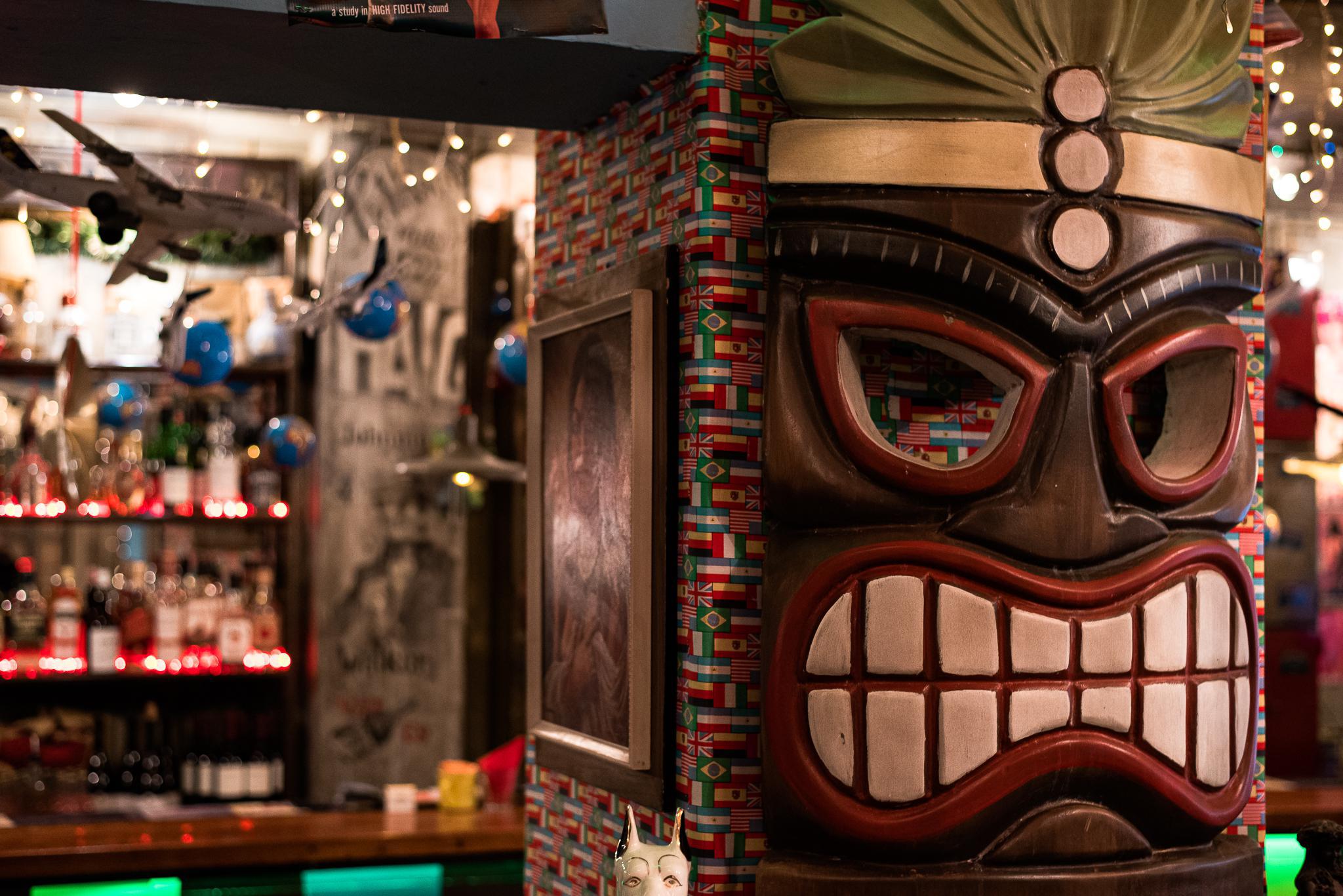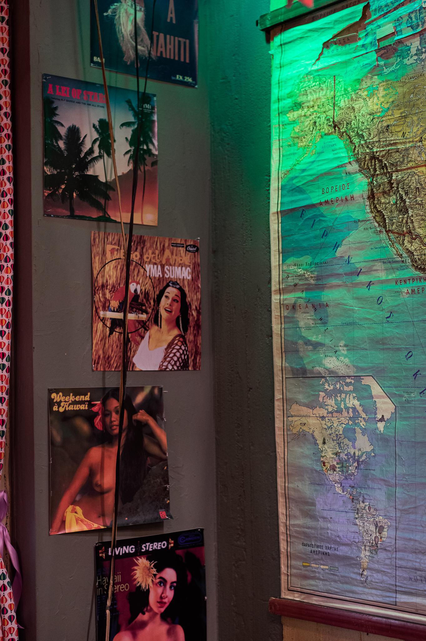 Υδρόγειες σφαίρες, ταξιδιωτικοί οδηγοί, χάρτες, σημαίες, αερόστατα, βαλίτσες, αυτοκόλλητα αποσκευών, σουβενίρ, αεροπλάνα, ενθύμια Χαβάης, εναλλάσσονται στους τοίχους και τα ράφια του,
