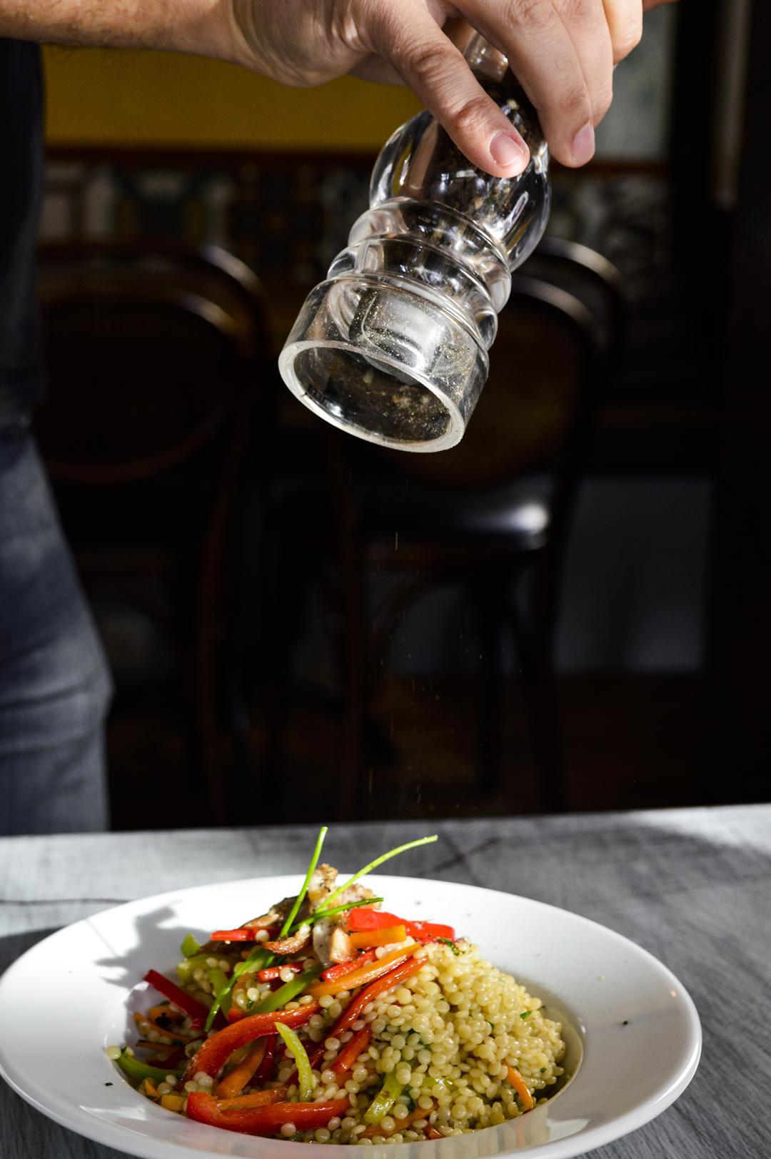 Ξεκινήσαμε τη δοκιμή από μια υπέροχη γραβιέρα σαγανάκι με μαρμελάδα ελιάς, το άπαιχτο τηγανιτό κους κους με λαχανικά και πανσέτα και τα συκωτάκια κοτόπουλου με το κρασί και το δεντρολίβανο, αληθινό λουκούμι. Τα συνοδεύσαμε με τη ρόκα με αχλάδι, φλούδες γραβιέρας και βαλσάμικο. Στα θαλασσινά το χταπόδι στη σχάρα με τη μαύρη μαγιονέζα, το σωταρισμένο καλαμαράκι με το πέστο βασιλικού, και το λαυράκι με τον πουρέ πατάτας ήταν απολαυστικότατα.