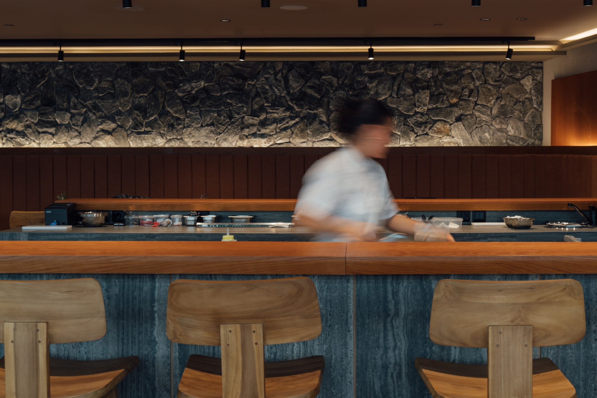 Η ανοιχτή κουζίνα φέρνει τη διαδικασία της δημιουργίας στο προσκήνιο, μετατρέποντας το μαγείρεμα σε μέρος της εμπειρίας.