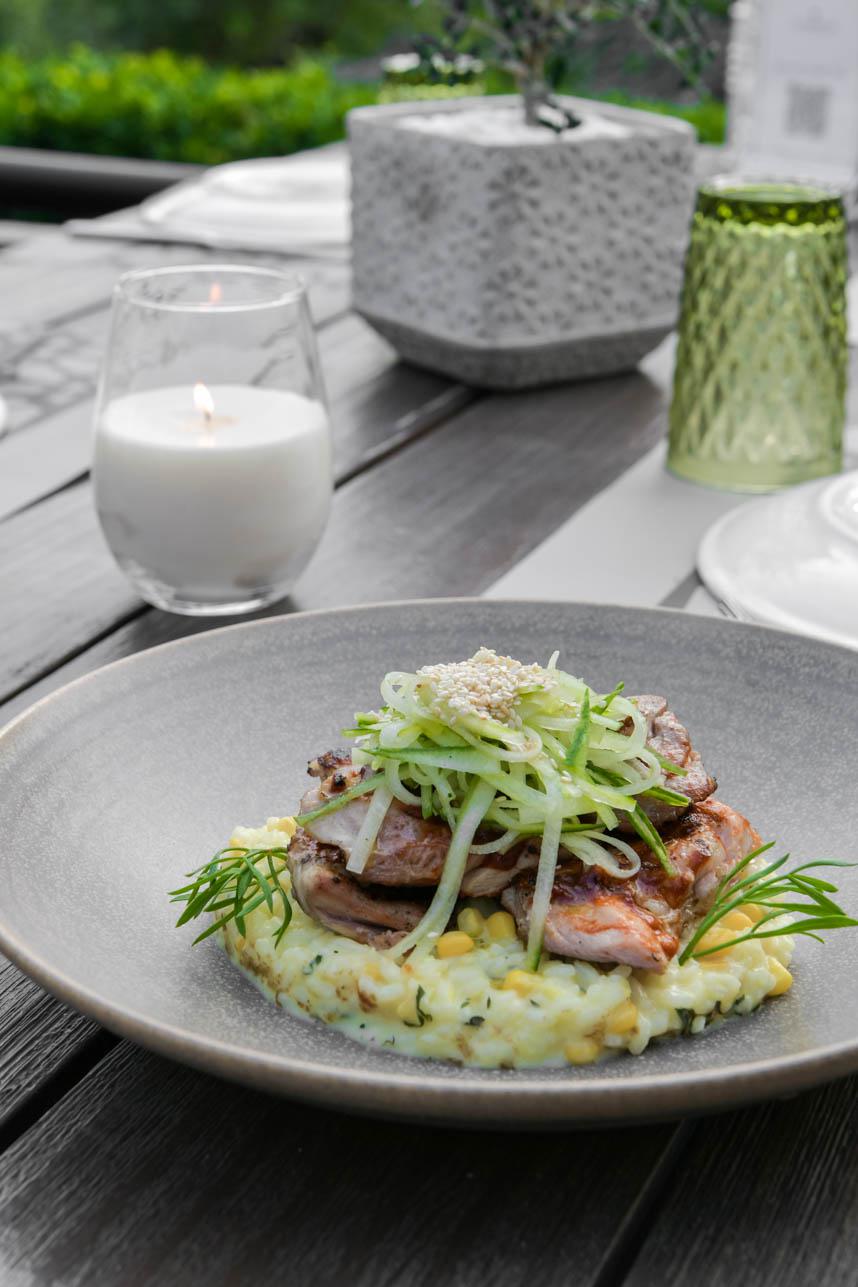 Μια πιο αρωματική επιλογή είναι το μπουτάκι κοτόπουλου ψημένο με μαρμελάδα λιαστής τομάτας, ριζότο από καλαμπόκι με πρόβιο γιαούρτι, βασιλικό και γλυκό λεμόνι.