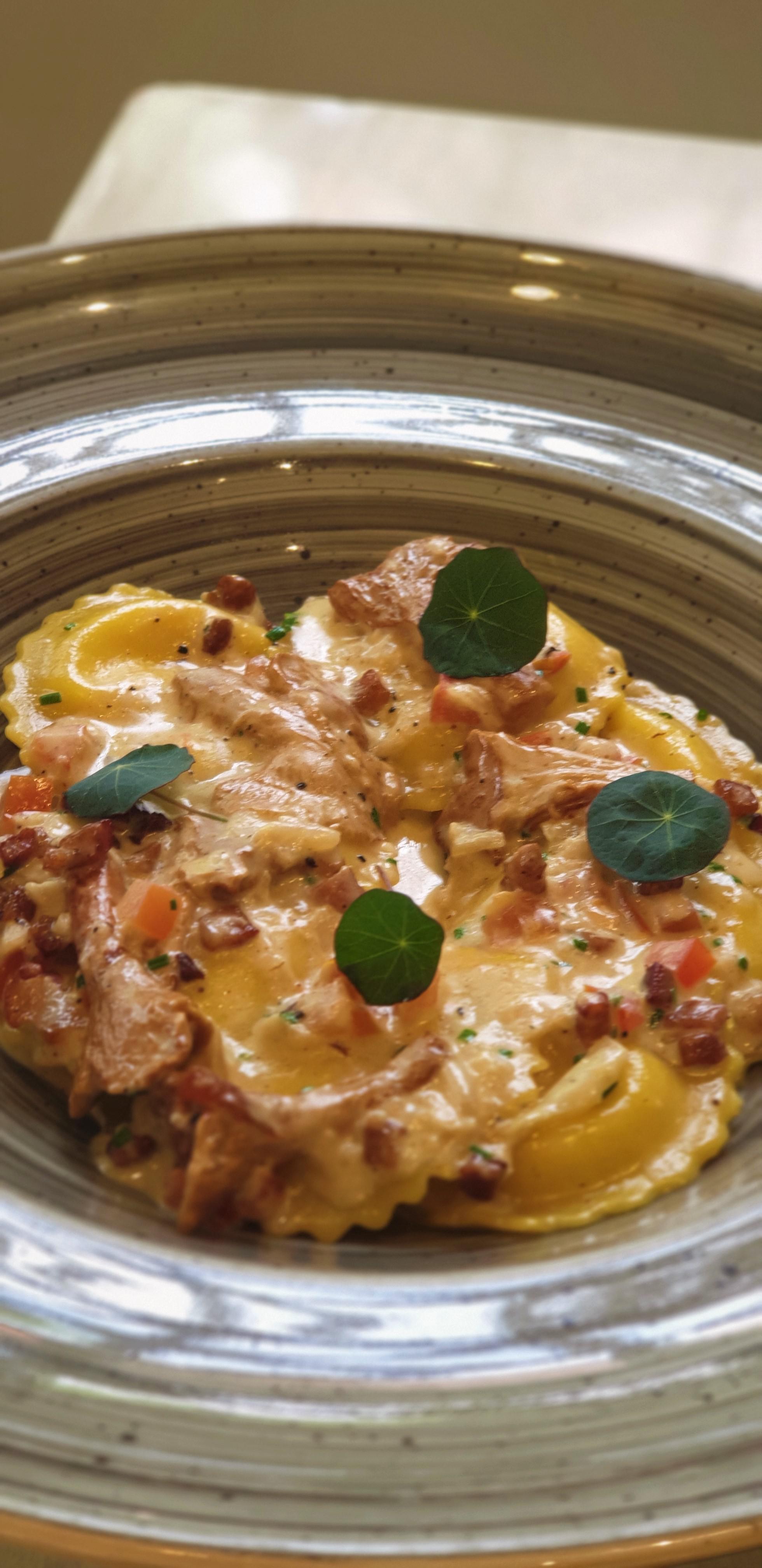 Αν είστε λάτρης των ζυμαρικών, πρέπει οπωσδήποτε να δοκιμάσετε τα φρέσκα ραβιόλια γεμιστά με buratta, κρέμα με μανιτάρια Κανθαρέλες, Guanciale και βούτυρο μαύρης τρούφας.
