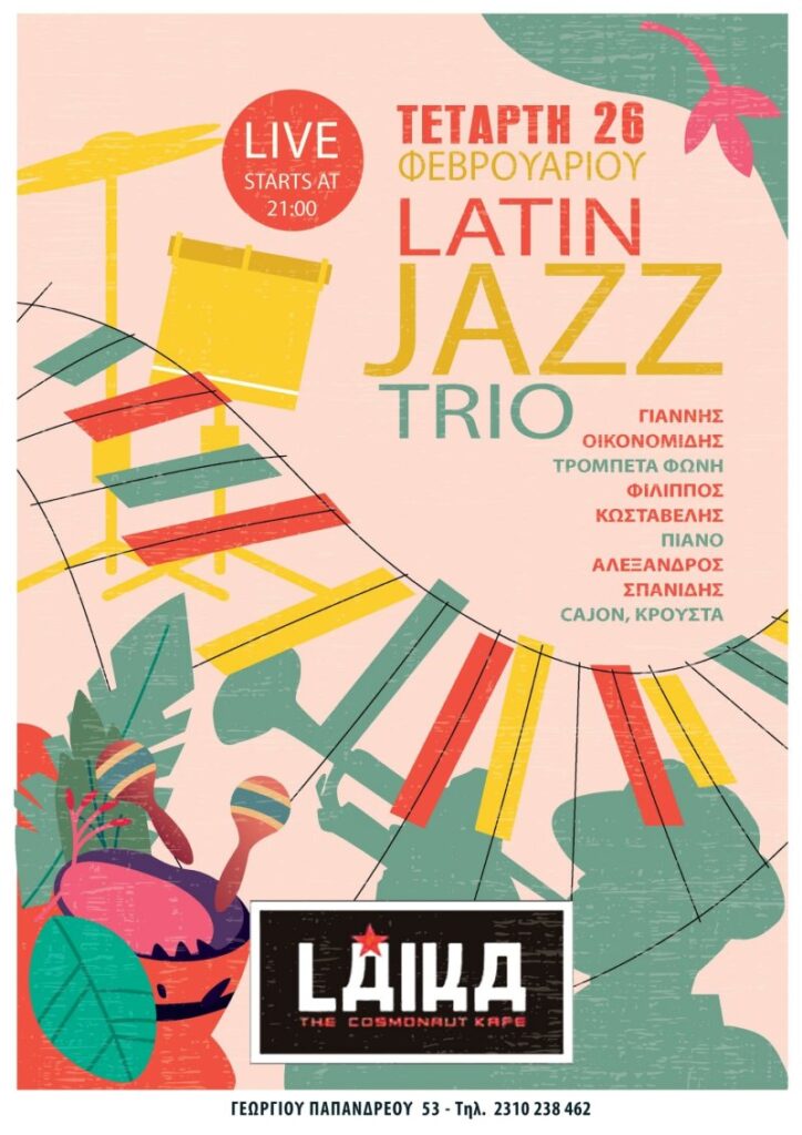 Την Τεταρτη 26/2, μετα τις 21.00, η Laika σε περιμένει για μια βραδιά με jazz latin ρυθμούς, με τους Γιάννη Οικονομίδη στην τρομπέτα, Φίλιππο Κωσταβέλη στο πιάνο και Αλέξανδρο Σπανίδη στα κρουστά!