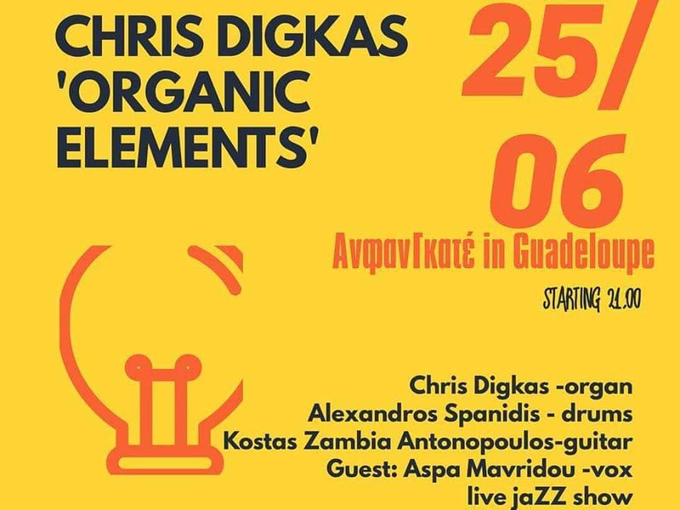 Ο Χρήστος Δίγκας μας συστήνεται ως οργανίστας με το project ORGANIC ELEMENTS. Ο ήχος του σχήματος αναδεικνύει το στύλ και το ύφος των σύγχρονων οργανιστών όπως οι Larry Young, Dr Lonnie Smith, Cory Henry, Joey De Francesco, Γιώργος Κοντραφούρης κ.α. Εκτός από καλοπαιγμένες διασκευές σε γνωστά standards θα ακουστούν και πρωτότυπες συνθέσεις απο τους προσώπικους δίσκους JASM TALES και JASMOVISION (ANKH music 2018).