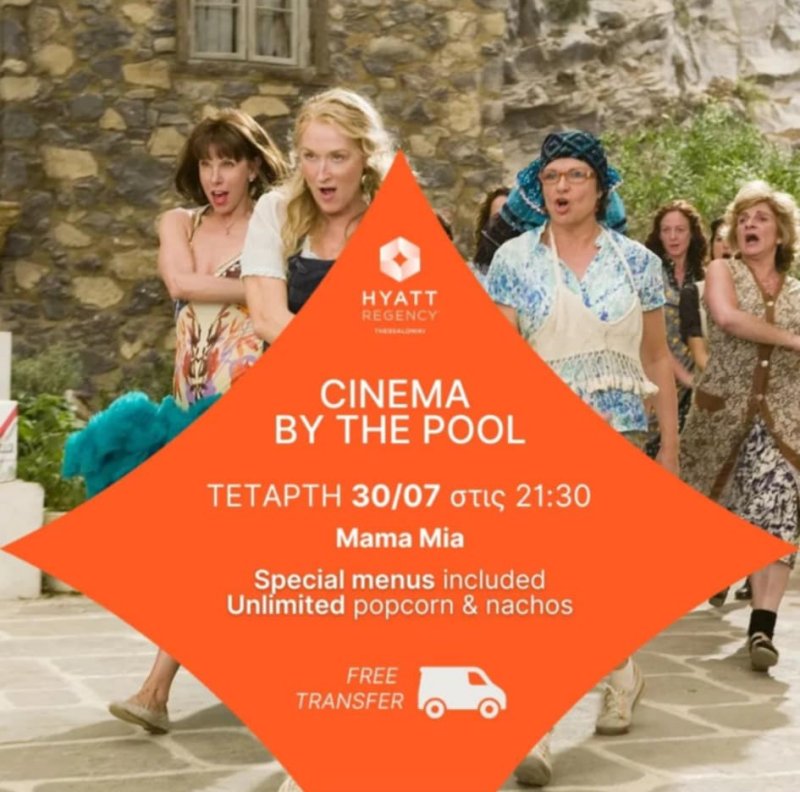Οι κήποι του Hyatt Regency Thessaloniki γεμίζουν μουσική, χορό και την ανεπιτήδευτη χαρά του Mamma Mia! Απόλαυσε την ταινία δίπλα στην πισίνα, με επιλογή από 4 θεματικά μενού και απεριόριστα pop corn & nachos.