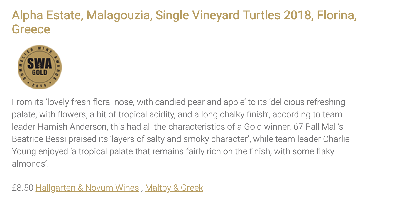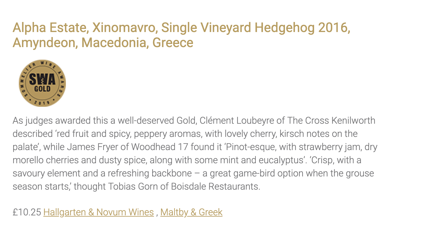 “Η Ελλάδα έχει γίνει μια από τις πιο ανυπόμονα αναμενόμενες κατηγορίες μας, ιδιαίτερα για τους λευκούς οίνους. Αλλά φέτος, τόσο οι ερυθροί όσο και οι λευκοί οίνοι έλαβαν μια ριψοκίνδυνη αποδοχή στον πρώτο γύρο της κρίσης, η οποία και αυτό δεν συμβαίνει πάντα μεταφράστηκε έπειτα σε μια σειρά κορυφαίων μεταλλίων και στο δεύτερο γύρο γευσιγνωσίας. Σε μια τόσο εντυπωσιακά θετική κατηγορία, φαίνεται σκληρό να ξεχωρίσουμε μόνο ένα αστέρι, αλλά δεν μπορούσαμε να αποφύγουμε την εκπληκτική απόδοση του Alpha Estate. Τρία Χρυσά Μετάλλια (μέση τιμή γύρω στις £ 10) είναι μια έξοχη προσπάθεια.”