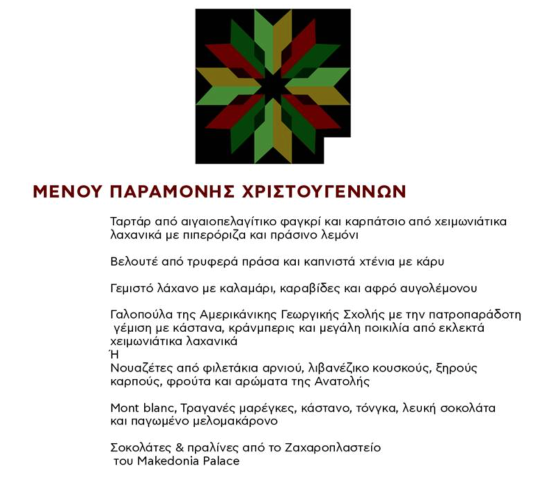 Χριστούγεννα: Η τιμή ανά άτομο ανέρχεται στα 120€, ενώ τα εξειδικευμένα μενού για χορτοφάγους και παιδιά αποδεικνύουν την υψηλή αίσθηση φιλοξενίας και τον επαγγελματισμό του ξενοδοχείου σε κάθε λεπτομέρεια.