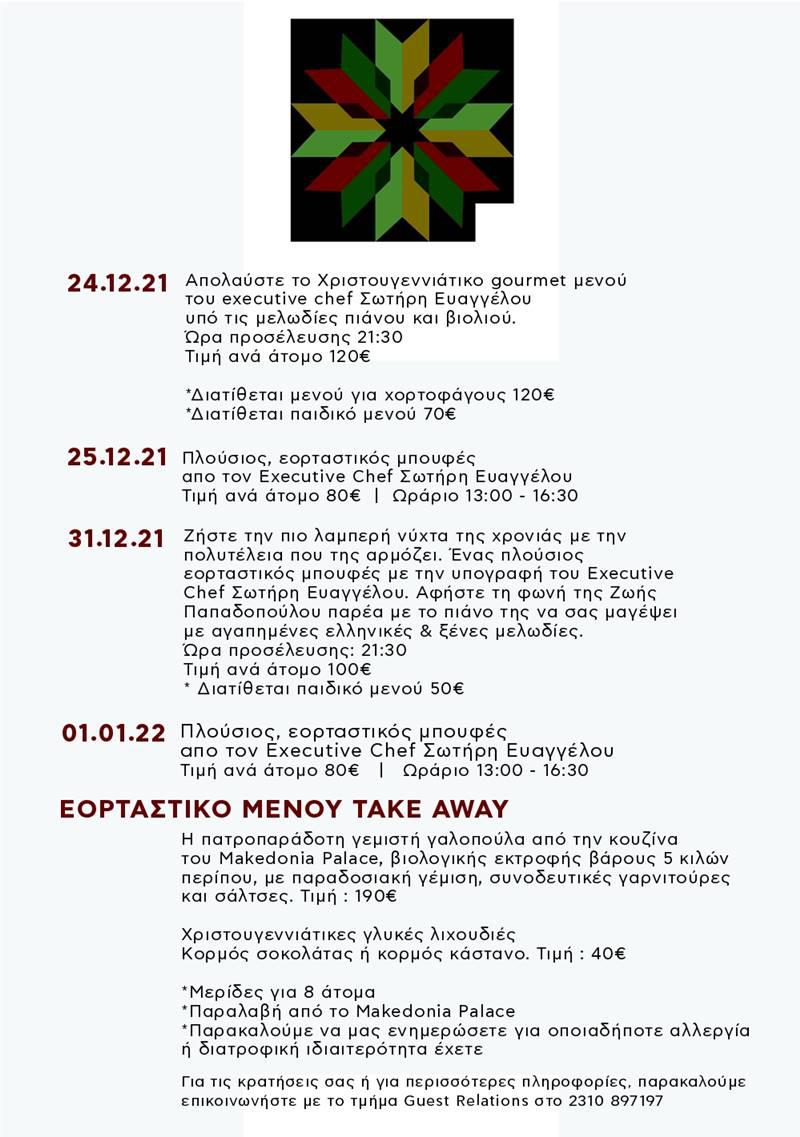 Highlight: Η πραγματική γαστρονομική έκπληξη για τις φετινές γιορτές είναι το εορταστικό μενού Τake away, μια κίνηση πολυτέλειας που μπορείτε ν’ απολαύσετε στο σπίτι. Η πατροπαράδοτη γεμιστή γαλοπούλα από την κουζίνα του ξενοδοχείου -βιολογικής εκτροφής και βάρους πέντε κιλών περίπου- με την παραδοσιακή γέμιση, συνοδευτικές γαρνιτούρες και σάλτσες, καθώς και χριστουγεννιάτικες γλυκές λιχουδιές, όπως κορμός σοκολάτας ή κορμός κάστανο, θα συνθέσουν ένα ιδιαίτερο γιορτινό τραπέζι με τη διαχρονική ποιότητα του Makedonia Palace.