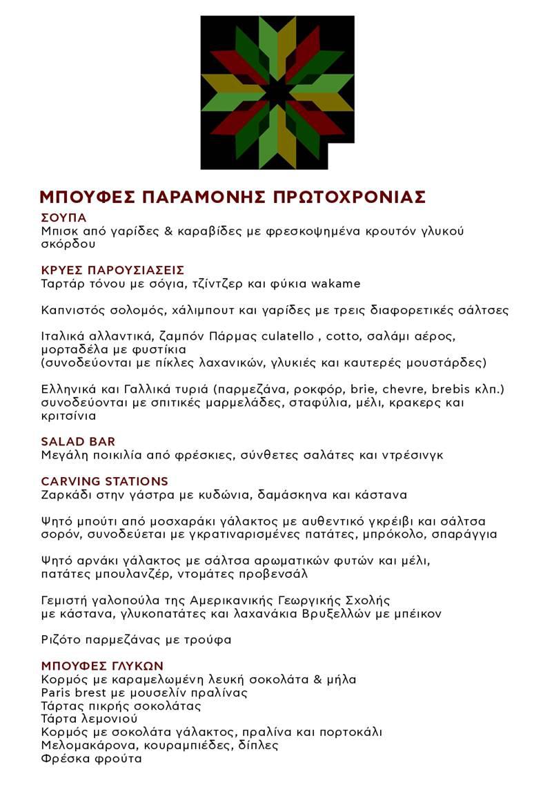 Εκεί που και σεις μπορείτε να υποδεχτείτε την καινούρια με την πολυτέλεια που της πρέπει και που αξίζετε. Ο ονειρεμένος εορταστικός μπουφές, με την υπογραφή του executive chef Σωτήρη Ευαγγέλου, έχει προτάσεις σε σούπα, όπως μπισκ από γαρίδες & καραβίδες, κρύα πιάτα, όπως το ταρτάρ τόνου, ο καπνιστός σολομός, τα ιταλικά αλλαντικά και τα ελληνικά και γαλλικά τυριά.