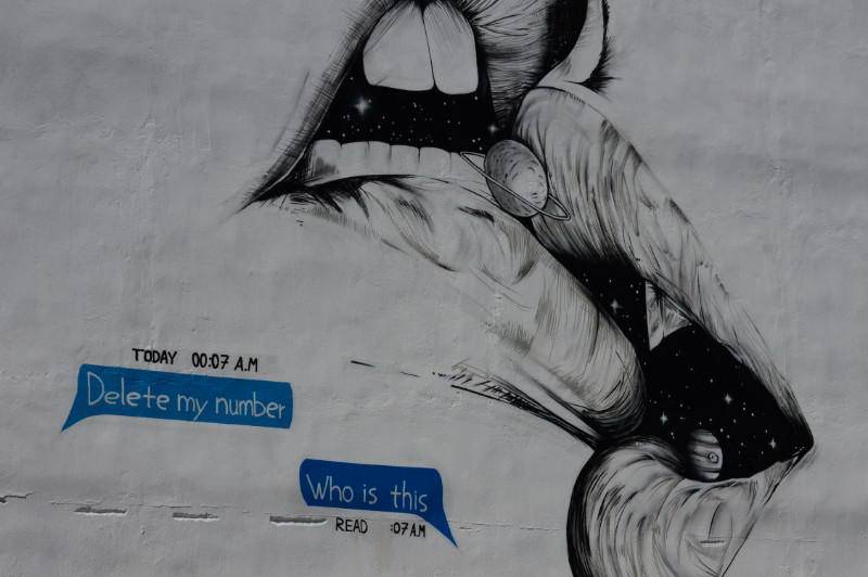 Στην αριστερή πλευρά, απεικονίζεται μια σύντομη ιντερνετική συνομιλία, με την οποία, ίσως, μπορούν να ταυτιστούν όλες οι νέες γενιές στον κόσμο. Την προστακτική του «Delete my number» ακολουθεί η αφοπλιστική απάντηση «Who is this», σε μια μάχη για το ποιος θα «ξεχάσει» πρώτος.