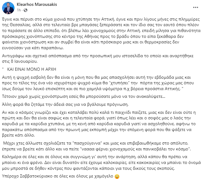 Στη μακροσκελή ανάρτησή του, παραθέτει τα όσα είχε προβλέψει λέγοντας ότι είχε κάνει λόγο για χιονόπτωση, όχι όμως χιονόστρωση.