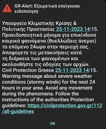 Συγκεκριμένα το μήνυμα αναφέρει: «Προειδοποιητικό μήνυμα για επικίνδυνα καιρικά φαινόμενα (θυελλώδεις άνεμοι) το επόμενο 24ωρο στην περιοχή σας. Αποφύγετε τις μετακινήσεις κατά τη διάρκεια των φαινομένων και ακολουθείτε τις οδηγίες των Αρχών».