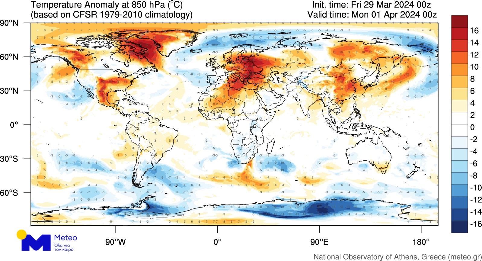 Σύμφωνα με τον ίδιο, «ενδιαφέρον έχει να δούμε και την ίδια εικόνα σε παγκόσμιο επίπεδο (δεύτερος χάρτης). Πολλές περιοχές του Βορείου Ημισφαιρίου αναμένεται να έχουν την Πρωταπριλιά πολύ υψηλές θερμοκρασίες, κυρίως σε περιοχές των ΗΠΑ, στον Ανατολικό Καναδά και στη Γροιλανδία, στο μεγαλύτερο μέρος της Ευρώπης (όπως προαναφέραμε) καθώς και περιοχές της Κίνας».