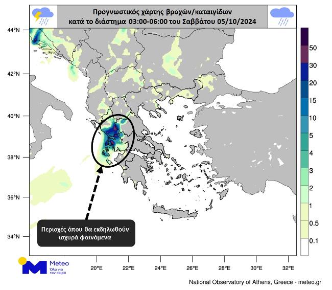 Β. Κατά τη διάρκεια της νύχτας και μέχρι το πρωί του Σαββάτου 05/10, τοπικά ισχυρά φαινόμενα αναμένονται στα Επτάνησα, στην Ήπειρο, στη Δυτική Στερεά, σε τμήματα της Θεσσαλίας και πιθανότατα σε περιοχές της Δυτικής Μακεδονίας και της Βορειοδυτικής Πελοποννήσου.