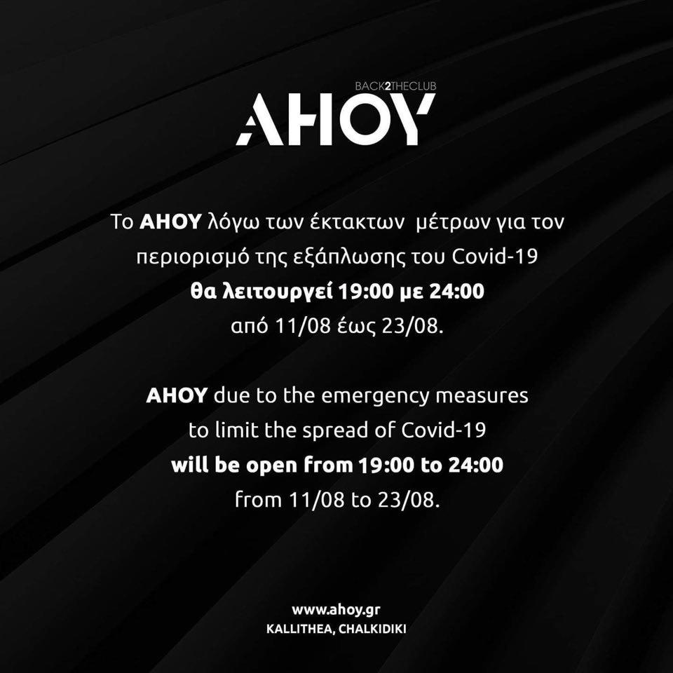 Το παλαιότερο Club της Χαλκιδικής, το AHOY, ενημέρωσε ήδη το κοινό του ότι θα λειτουργεί από τις 19.00 έως και τα μεσάνυχτα. Το τροποποιημένο ωράριο εφαρμόζεται από σήμερα μέχρι και τις 23 Αυγούστου, περίοδο κατά την οποία θα ισχύουν τα έκτακτα μέτρα προστασίας από τον κορωνοϊό.