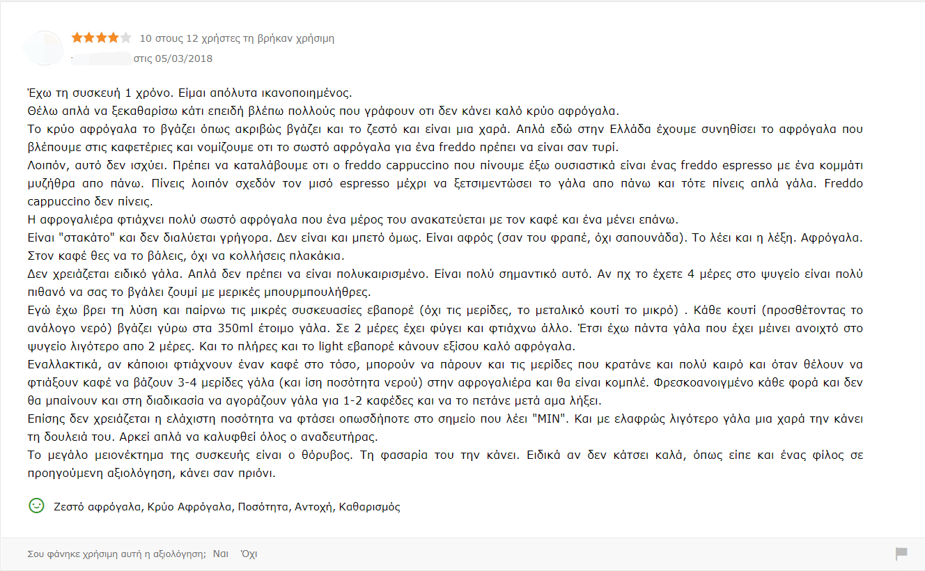 Ο εξοργισμένος αγοραστής θέλησε να χαρακτηρίσει άριστη την μηχανή αφρόγαλου αλλά και να ισοπεδώσει τις υπόλοιπες απλές κριτικές. Το κείμενο παρ’ όλο που είναι μεγάλο χαρίζει απερίγραπτο γέλιο στους εν δυνάμει αγοραστές. «Έχω τη συσκευή 1 χρόνο. Είμαι απόλυτα ικανοποιημένος. Θέλω απλά να ξεκαθαρίσω κάτι επειδή βλέπω πολλούς που γράφουν ότι δεν κάνει καλό κρύο αφρόγαλα. Το κρύο αφρόγαλα το βγάζει όπως ακριβώς βγάζει και το ζεστό και είναι μια χαρά. Απλά εδώ στην Ελλάδα έχουμε συνηθίσει το αφρόγαλα που βλέπουμε στις καφετέριες και νομίζουμε ότι το σωστό αφρόγαλα για ένα freddo πρέπει να είναι σαν τυρί. Λοιπόν, αυτό δεν ισχύει. Πρέπει να καταλάβουμε ότι ο freddo cappuccino που πίνουμε έξω ουσιαστικά είναι ένας freddo espresso με ένα κομμάτι μυζήθρα από πάνω. Πίνεις λοιπόν σχεδόν τον μισό espresso μέχρι να ξετσιμεντώσει το γάλα από πάνω και τότε πίνεις απλά γάλα. Freddo cappuccino δεν πίνεις. H αφρογαλιέρα φτιάχνει πολύ σωστό αφρόγαλα που ένα μέρος του ανακατεύεται με τον καφέ και ένα μένει επάνω. Είναι “στακάτο” και δεν διαλύεται γρήγορα. Δεν είναι και μπετό όμως. Είναι αφρός (σαν του φραπέ, όχι σαπουνάδα). Το λέει και η λέξη. Αφρόγαλα. Στον καφέ θες να το βάλεις, όχι να κολλήσεις πλακάκια. Δεν χρειάζεται ειδικό γάλα. Απλά δεν πρέπει να είναι πολυκαιρισμένο. Είναι πολύ σημαντικό αυτό. Αν πχ το έχετε 4 μέρες στο ψυγείο είναι πολύ πιθανό να σας το βγάλει ζουμί με μερικές μπουρμπουλήθρες. Εγώ έχω βρει τη λύση και παίρνω τις μικρές συσκευασίες εβαπορέ (όχι τις μερίδες, το μεταλλικό κουτί το μικρό) . Κάθε κουτί (προσθέτοντας το ανάλογο νερό) βγάζει γύρω στα 350ml έτοιμο γάλα. Σε 2 μέρες έχει φύγει και φτιάχνω άλλο. Έτσι έχω πάντα γάλα που έχει μείνει ανοιχτό στο ψυγείο λιγότερο από 2 μέρες. Και το πλήρες και το light εβαπορέ κάνουν εξίσου καλό αφρόγαλα. Εναλλακτικά, αν κάποιοι φτιάχνουν έναν καφέ στο τόσο, μπορούν να πάρουν και τις μερίδες που κρατάνε και πολύ καιρό και όταν θέλουν να φτιάξουν καφέ να βάζουν 3-4 μερίδες γάλα (και ίση ποσότητα νερού) στην αφρογαλιέρα και θα είναι κομπλέ. Φρεσκοανοιγμένο κάθε φορά και δεν θα μπαίνουν και στη διαδικασία να αγοράζουν γάλα για 1-2 καφέδες και να το πετάνε μετά άμα λήξει. Επίσης δεν χρειάζεται η ελάχιστη ποσότητα να φτάσει οπωσδήποτε στο σημείο που λέει “ΜΙΝ”. Και με ελαφρώς λιγότερο γάλα μια χαρά την κάνει τη δουλειά του. Αρκεί απλά να καλυφθεί όλος ο αναδευτήρας. Το μεγάλο μειονέκτημα της συσκευής είναι ο θόρυβος. Τη φασαρία του την κάνει. Ειδικά αν δεν κάτσει καλά, όπως είπε και ένας φίλος σε προηγούμενη αξιολόγηση, κάνει σαν πριόνι».
