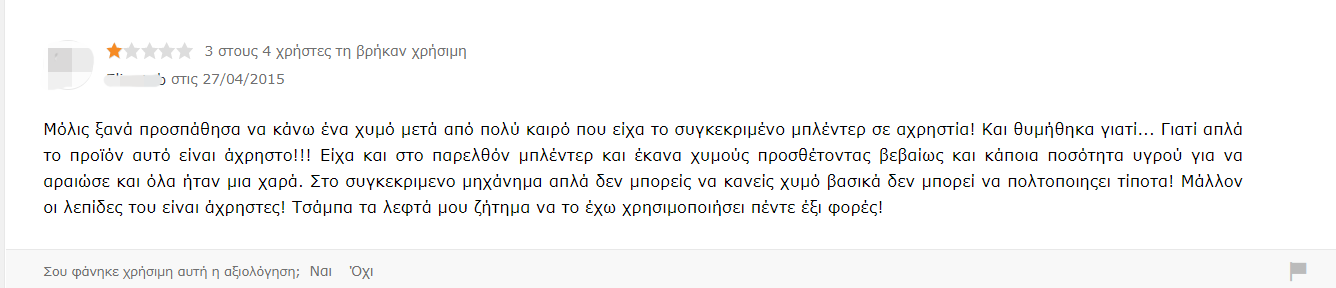 Ο συγκεκριμένος καταναλωτής για αποχυμωτή κριτίκαρε αρνητικά :«Μόλις ξανά προσπάθησα να κάνω χυμό μετά από πολύ καιρό που είχα το συγκεκριμένο μπλέντερ σε αχρηστία! Και θυμήθηκα γιατί…. Γιατί απλά το προϊόν αυτό είναι άχρηστο!!! Είχα και στο παρελθόν μπλέντερ και έκανα χυμούς προσθέτοντας βεβαίως και κάποια ποσότητα υγρού για να αραιώσει και όλα ήταν μια χαρά. (…)».