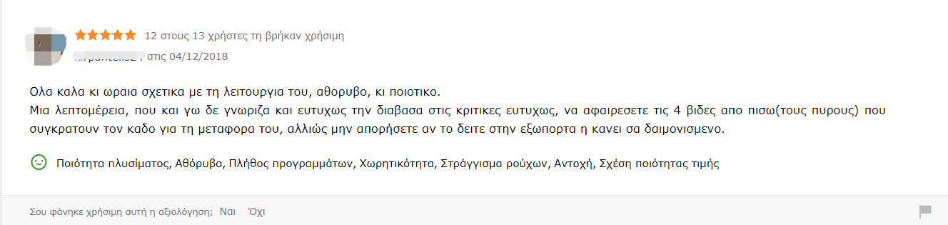 Σε προϊόν πλυντηρίου ένας χρήστης σχολίασε την παρακάτω κριτική: «Όλα καλά κι ωραία σχετικά με τη λειτουργία του, αθόρυβο, κι ποιοτικό. Μια λεπτομέρεια, που και εγώ δε γνώριζα και ευτυχώς την διάβασα στις κριτικές ευτυχώς, να αφαιρέσετε τις 4 βίδες από πίσω (τους πίρους) που συγκρατούν τον κάδο για τη μεταφορά του, αλλιώς μην απορήσετε αν το δείτε στην εξώπορτα η κάνει σαν δαιμονισμένο».