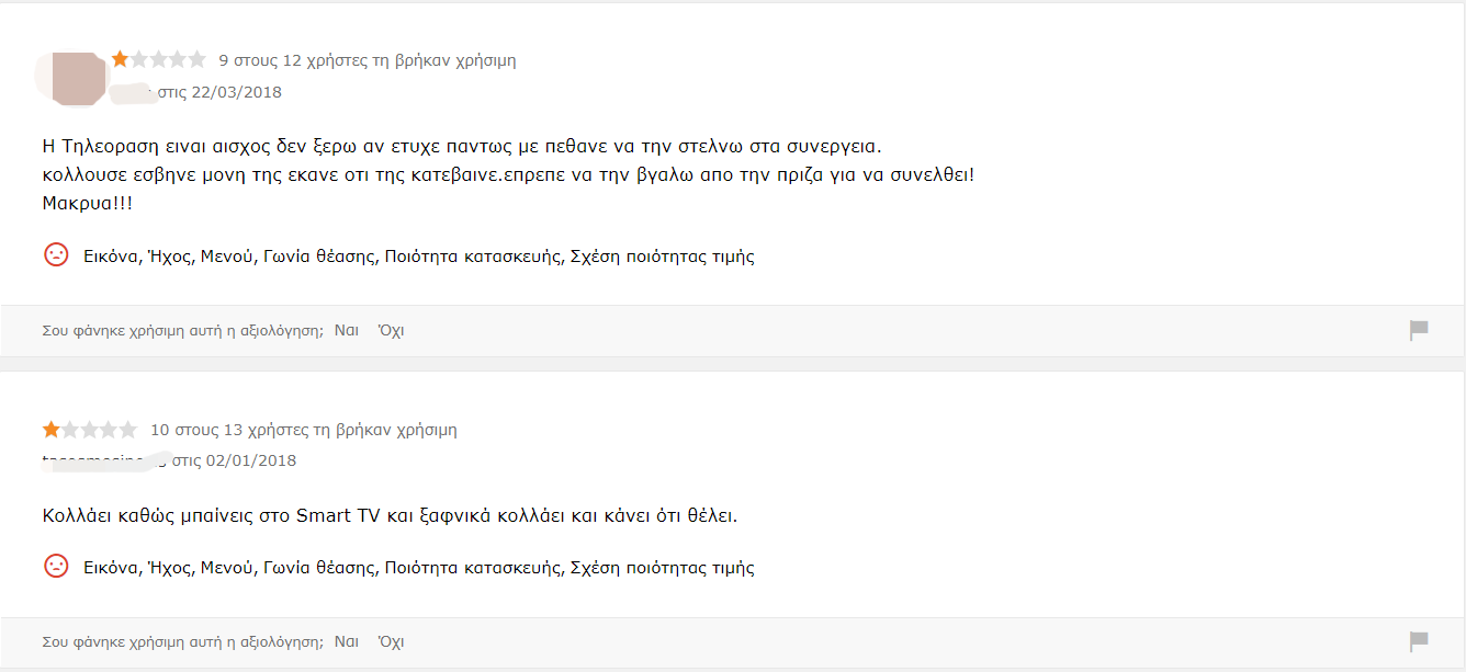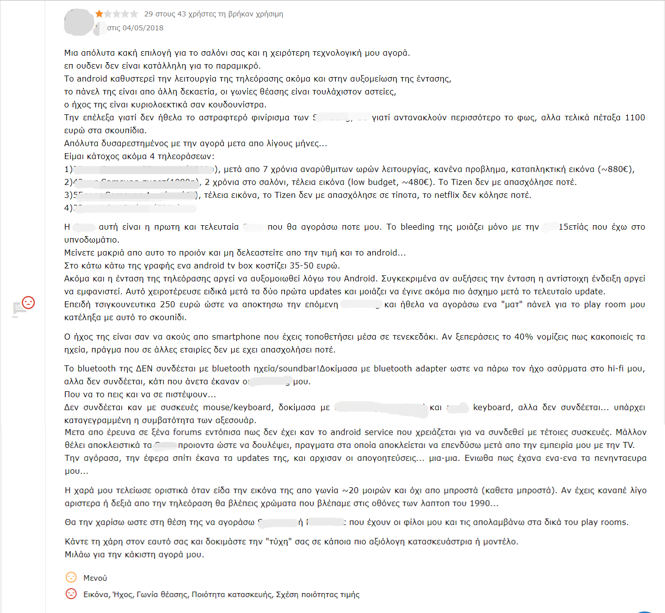 Η αγορά μίας τηλεόρασης είναι άκρως σημαντική, από το μέγεθος, την ευκρίνεια και πολλά άλλα έως την τιμή. Οι συγκεκριμένοι χρήστες είχαν να γράψουν μία ενδιαφέρουσα κριτική για το συγκεκριμένο μοντέλο: «Η τηλεόραση είναι αίσχος δεν ξέρω αν έτυχε πάντως με πέθανε να την στέλνω στα συνεργεία. Κολλούσε έσβηνε μόνη της, έκανε ό,τι της κατέβαινε. Έπρεπε να την βγάλω από την πρίζα για να συνέλθει! Μακρυά!!» και «Κολλάει καθώς μπαίνει στο Smart TV και ξαφνικά κολλάει και κάνει ό,τι θέλει».