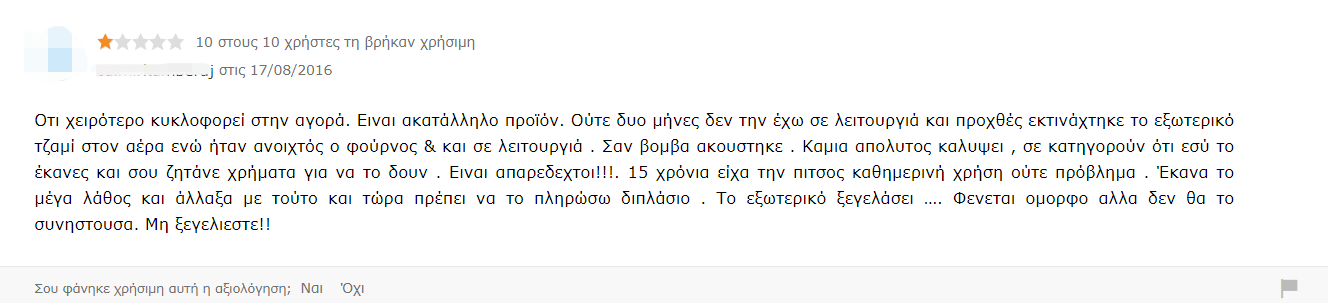 Ξέρουμε όλοι την κρίση υστερίας και το «κακό που μπορεί να βρει» το σπίτι μας όταν χαλάει ο φούρνος στο σπίτι. Η μαμά με τις θείες και τις γιαγιάδες μοιρολογούν την πολυαγαπημένη τους συσκευή ενώ οι υπόλοιποι προσπαθείτε να βρείτε κάποιο μοντέλο (αν όχι το ίδιο) που θα τους ικανοποιήσει. Αλλιώς δημιουργούνται τέτοιες κριτικές:«Ό,τι χειρότερο κυκλοφορεί στην αγορά.(…) και προχθές εκτινάχτηκε το εξωτερικό τζάμι στον αέρα ενώ ήταν ανοιχτός ο φούρνος και σε λειτουργία. Σαν βόμβα ακούστηκε. (…) Φαίνεται όμορφο αλλά δεν θα το συνιστούσα. Μην ξεγελιέστε !».