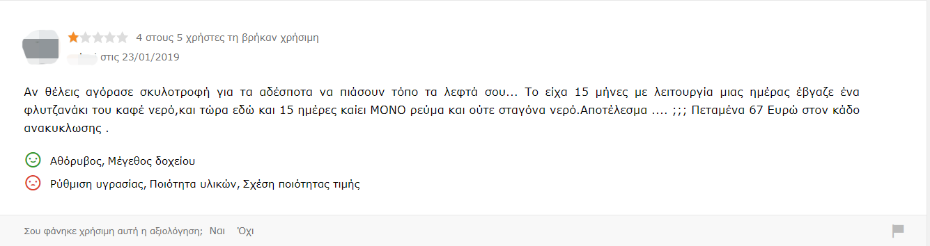Μία από τις κριτικές σε αφυγραντήρα τραβάει το ενδιαφέρον του καταναλωτή. «Αν θέλεις αγόρασε σκυλοτροφή για τα αδέσποτα να «πιάσουν» τόπο τα λεφτά σου… (…) Πεταμένα 67 ευρώ στον κάδο ανακύκλωσης».
