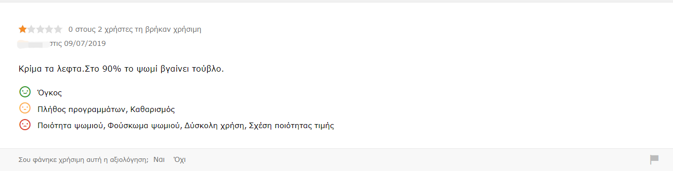 Έχοντας βαθμολογήσει το προϊόν με τέσσερα στα πέντε αστέρια, ο χρήστης γράφει:«Πολύ καλό προϊόν αλλά ώρες ώρες αν δεν είναι στην σωστή θέση κάνει σαν αλυσοπρίονο».
