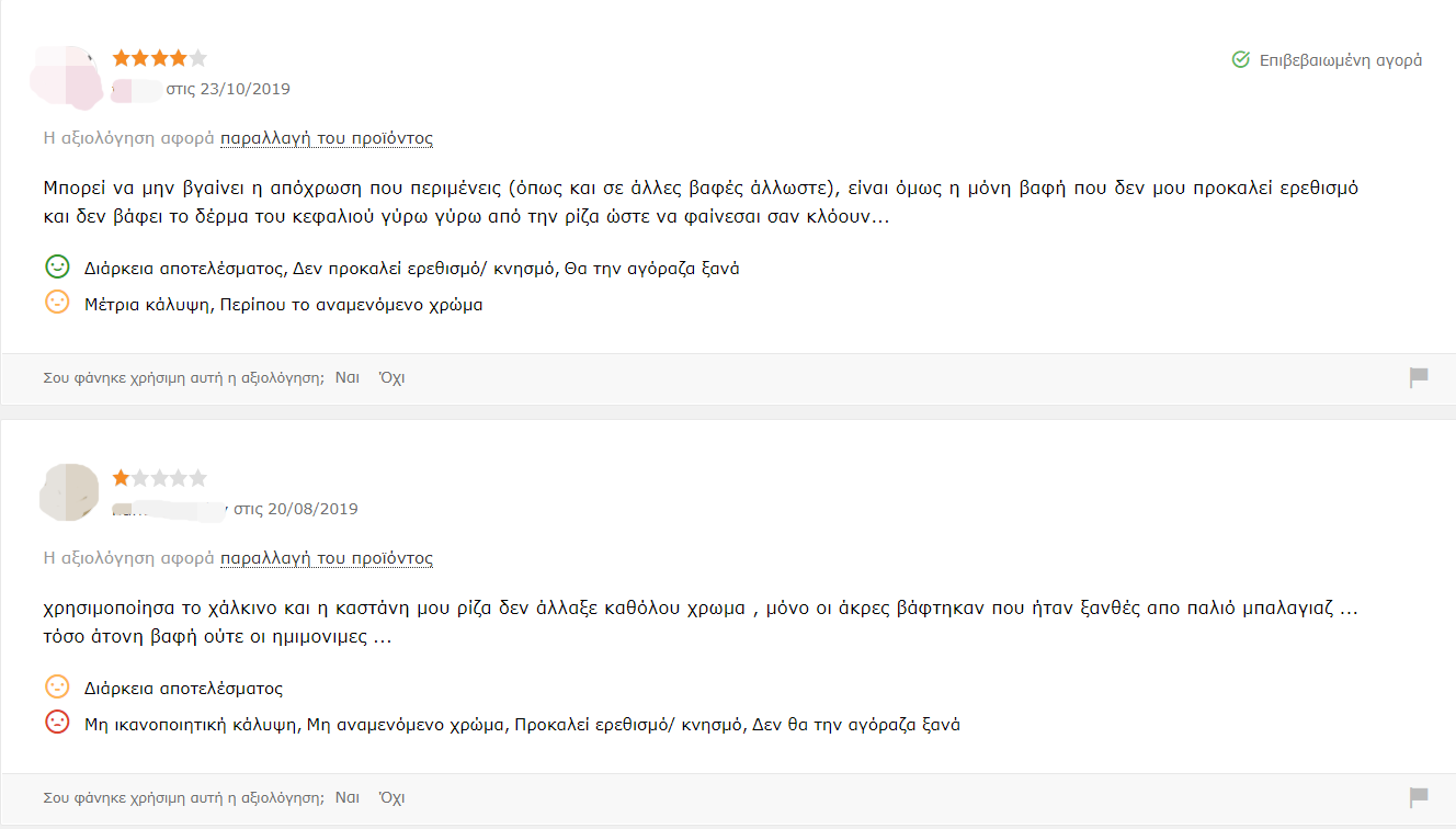 Κάτω από γνωστή μάρκα βαφής μαλλιών πολλές γυναίκες έκαναν αρνητικές κριτικές για το αποτέλεσμα και την ίδια την βαφή. Αυτές που ξεχώρισαν είναι οι παρακάτω: «Μπορεί να μην βγαίνει η απόχρωση που περιμένεις όπως και σε άλλες βαφές άλλωστε, είναι όμως η μόνη μόνιμη βαφή που δεν μου προκαλεί ερεθισμό και δεν βάφει το δέρμα του κεφαλιού γύρω γύρω από την ρίζα ώστε να φαίνεσαι σαν κλόουν».
