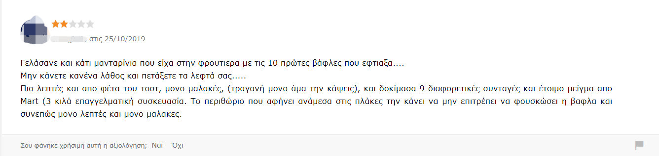 Ίσως από τις λίγες κριτικές που θα σε κάνουν να γελάσεις με τον «πόνο» του άλλου. Ο αγοραστής της συσκευής παρασκευής βάφλας έγραψε:«Γελάσανε και τα μανιτάρια που είχα στην φρουτιέρα με τις 10 πρώτες βάφλες που έφτιαξα… Μην κάνετε κανένα λάθος και πετάξετε τα λεφτά σας… Πιο λεπτές και από φέτα τους τοστ, μόνο μαλακές, (τραγανή μόνο άμα την κάψεις), και δοκίμασα 9 διαφορετικές συνταγές και έτοιμο μείγμα από Mart (3 κιλά επαγγελματική συσκευασία). Το περιθώριο που αφήνει ανάμεσα στις πλάκες την κάνει να μην επιτρέπει να φουσκώσει η βάφλα και συνεπώς μόνο λεπτές και μόνο μαλακές».