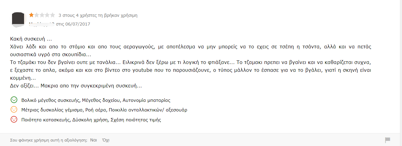 Όλοι μας όταν αγοράζουμε μία συσκευή σκεφτόμαστε αν θα «βγάλει» τα λεφτά της, θα αντέξει στο πέρασμα του χρόνου και στην φθορά ή θα μας «μείνει» στα χέρια; Ωστόσο κάποιες φορές οι κατασκευαστές κάνουν λάθη με αποτέλεσμα το προϊόν από άφθαρτο να γίνεται άχρηστο. Ο συγκεκριμένος χρήστης για ηλεκτρονικό τσιγάρο έγραψε:«Κακή συσκευή… Χάνει λάδι και από το στόμιο και από τους αεραγωγούς, με αποτέλεσμα να μην μπορείς να το έχεις σε τσέπη ή τσάντα, αλλά και να πετάς ουσιαστικά υγρό στα σκουπίδια… Το τζαμάκι του δεν βγαίνει ούτε με τανάλια… Ειλικρινά δεν ξέρω με τι λογική το φτιάξανε… Το τζαμάκι πρέπει να βγαίνει και να καθαρίζεται συχνά, ε ξεχάστε το απλά, ακόμα και στο βίντεο στο youtube που το παρουσιάζουν, ο τύπος μάλλον το έσπασε για να το βγάλει, γιατί η σκηνή είναι κομμένη… Δεν αξίζει… Μακριά από την συγκεκριμένη συσκευή..».