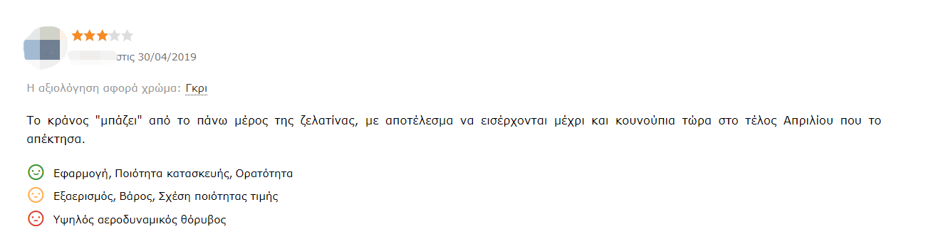 Η προστασία στην οδήγηση είναι άκρως σημαντική ιδίως όταν αναφερόμαστε σε μηχανές! Ο συγκεκριμένος χρήστης είχε να κάνει κάποια παράπονα για την πρόσφατη αγορά τους: «Το κράνος «μπάζει» από το πάνω μέρος της ζελατίνας, με αποτέλεσμα να εισέρχονται μέχρι και κουνούπια τώρα στο τέλος Απριλίου που το απέκτησα».
