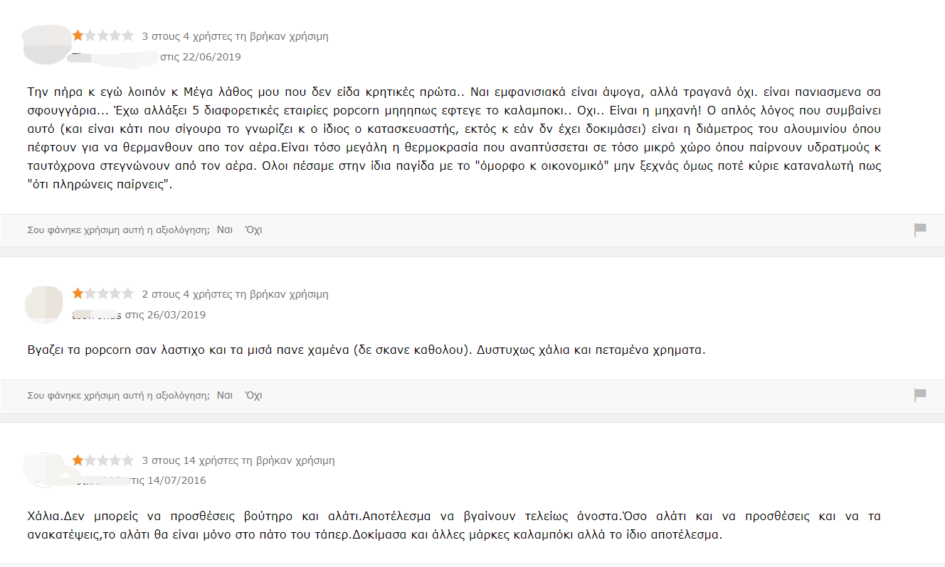 Άλλοι δύο αγοραστές σχολίασαν:«Βγάζει τα ποπ κορν σαν λάστιχο και τα μισά πάνε χαμένα (δεν σκάνε καθόλου). Δυστυχώς χάλια και πεταμένα χρήματα» και «Χάλια. Δεν μπορείς να προσθέσεις βούτυρο και αλάτι. Αποτέλεσμα να βγαίνουν τελείως άνοστα(…)»
