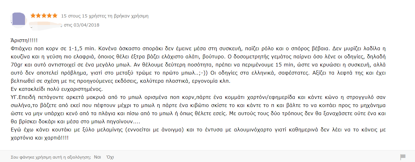Σε συσκευή παρασκευής ποπ κορν εμφανώς ενθουσιασμένος καταναλωτής σχολίασε την άριστη συσκευή καθώς και τρόπους για την παρασκευή:« Άριστη!!!!! Φτιάχνει ποπ κορν σε 1-1,5 λεπτά. Κανένα άσκαστο σποράκι δεν έμεινε μέσα στη συσκευή, παίζει ρόλο και ο σπόρος βέβαια. Δεν μυρίζει λαδίλα η κουζίνα και η γεύση πιο ελαφριά(…) ΥΓ. Επειδή πετάγονται αρκετά μακριά από το μπολ ορισμένα ποπ κορν, πάρτε ένα κομμάτι χαρτόνι/εφημερίδα και κάντε κώνο η στρογγυλό σαν σωλήνα, το βάζετε από εκεί που πέφτουν μέχρι το μπολ ή πάρτε ένα κιβώτιο σκίστε το και κάντε το Π και βάλτε το να κοιτάει προς το μηχάνημα ώστε να μην υπάρχει κενό από τα πλάγια και πίσω ή όπως θέλετε εσείς(..)».