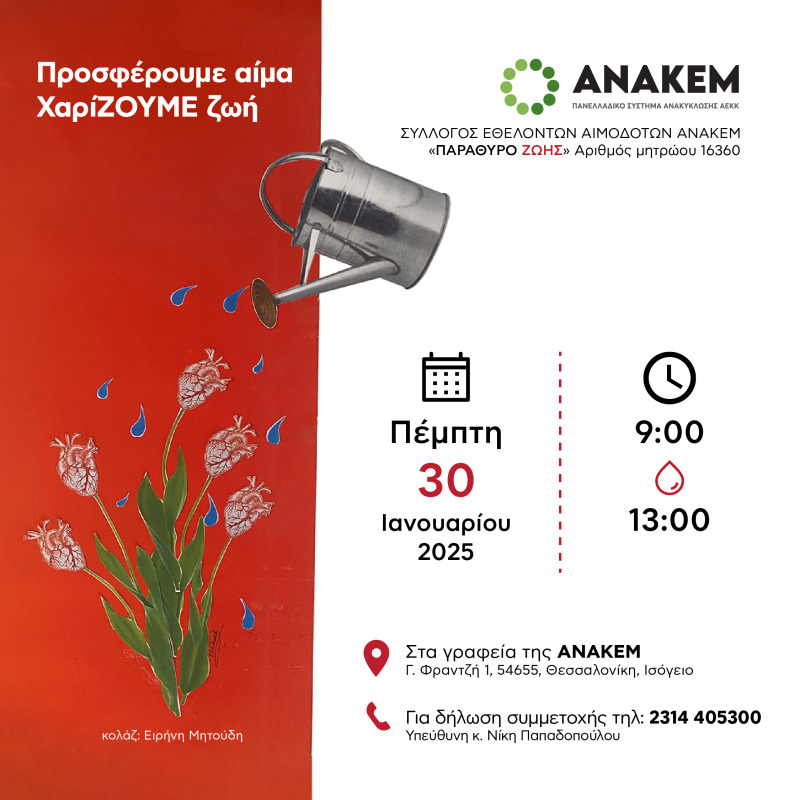 Την Πέμπτη 30 Ιανουαρίου, στα γραφεία της ΑΝΑΚΕΜ, στη Θεσσαλονίκη ανοίγουμε ένα «ΠΑΡΑΘΥΡΟ ΖΩΗΣ» στους συνανθρώπους μας, ενισχύοντας την Τράπεζα Αίματος της χώρας μας.