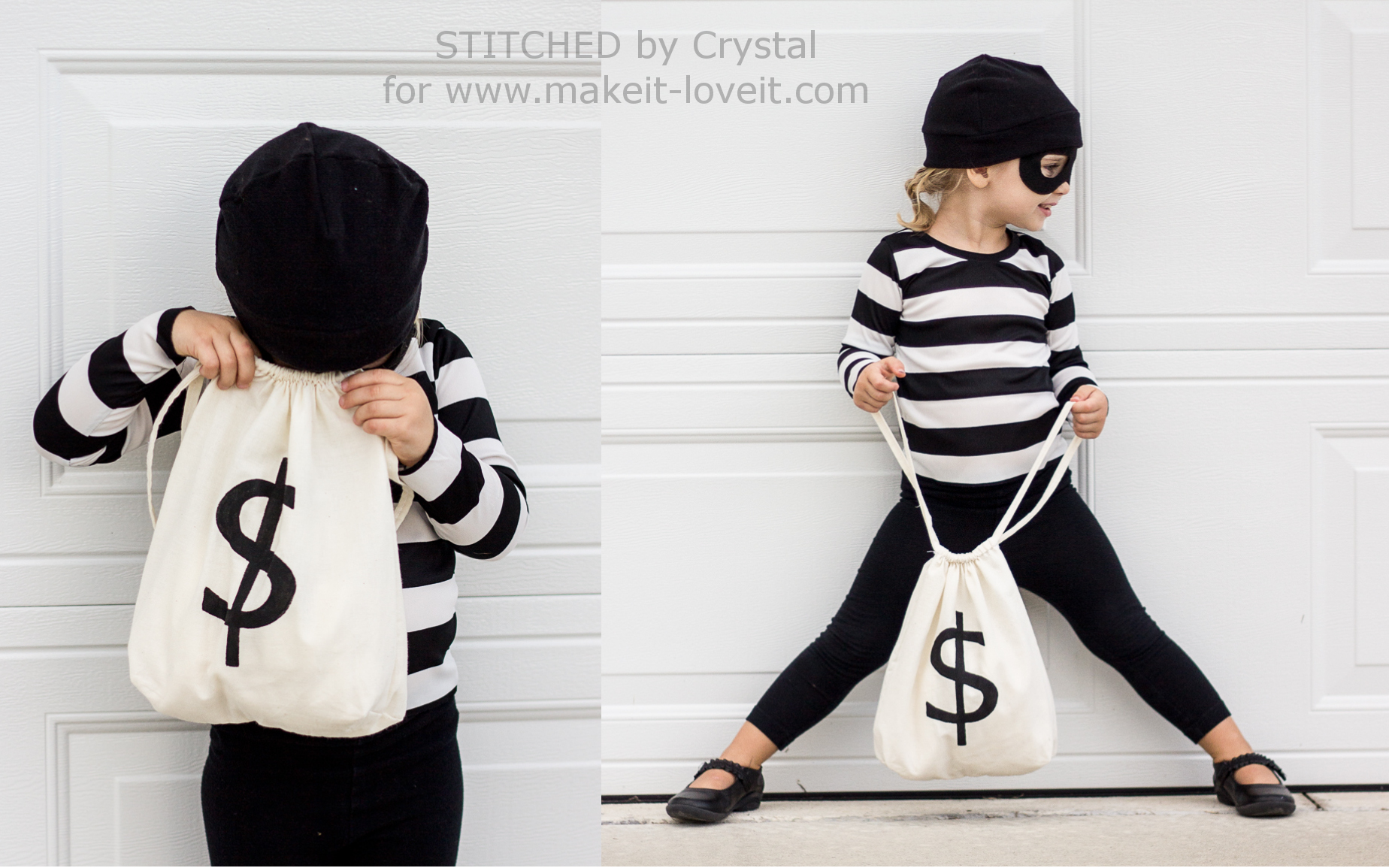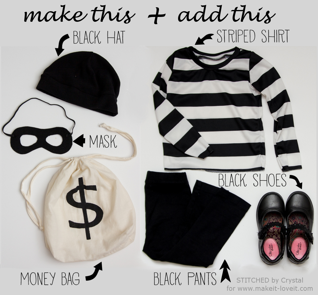 Χαρτόνι βελουτέ σε μαύρο χρώμα, ένα μικρό λαστιχάκι και μία πάνινη τσάντα λευκή. Κόψε το χαρτόνι στα παραπάνω σχέδια και κόλλησέ το στην τσάντα “με τα δολλάρια”. Δημιούργησε μία μάσκα πολύ απλά και τα υπόλοιπα τα έχεις ήδη στην ντουλάπα του. Μαύρο παντελόνι, μαύρα παπούτσια και ένα t shirt μαρινιέρα.
