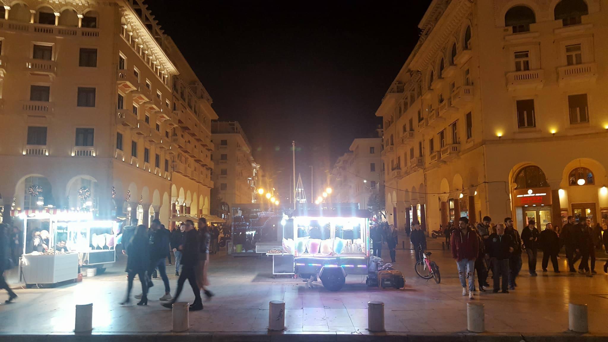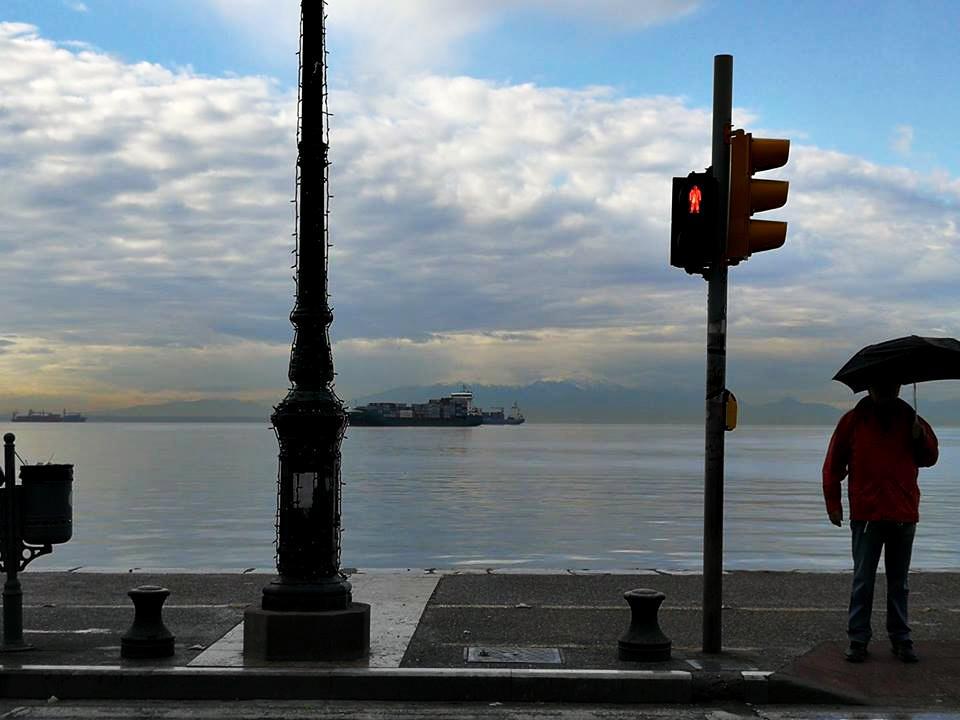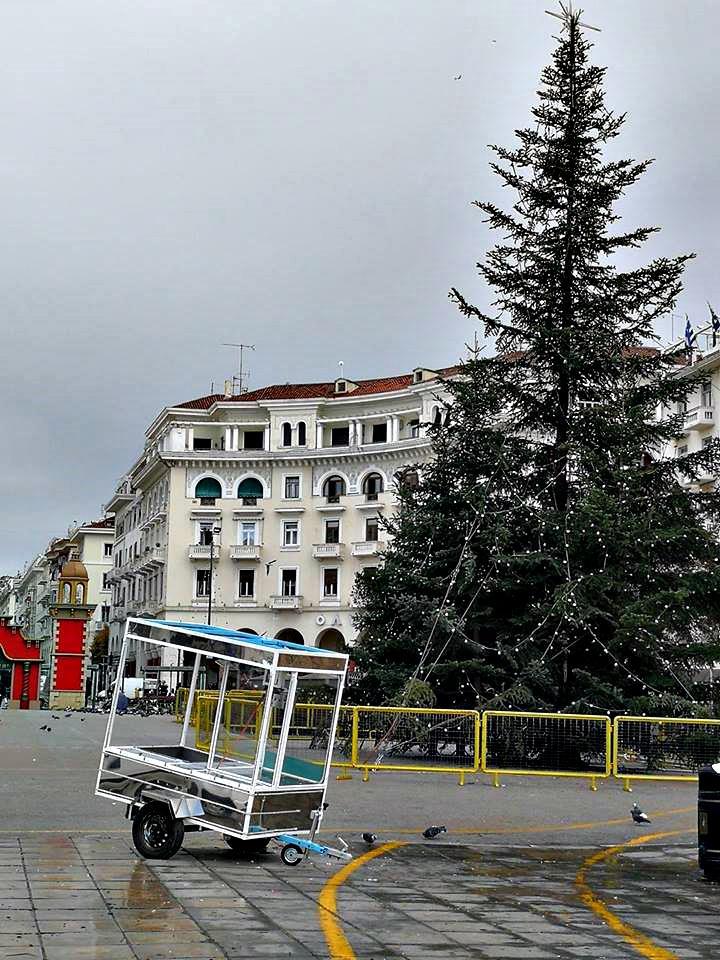 Λίγο ο μουντός καιρός που ταιριάζει τόσο στην Θεσσαλονίκη, η πρωινή υγρασία, το χριστουγεννιάτικο σκηνικό στην πλατεία Αριστοτέλους με μόνιμους επισκέπτες τα περιστέρια και την γυναίκα που στέκει εκεί χειμώνα καλοκαίρι αλλά και οι λιγοστοί πεζοί στο κέντρο της πόλης, έκαναν τους δρόμους να μοιάζουν με έρημο γοητευτικό τοπίο.