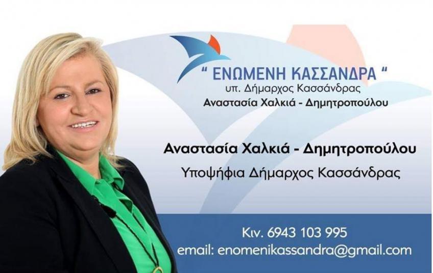 Τα καθήκοντα της Δημάρχου στο Δήμο Κασσάνδρας αναλαμβάνει η κ. Αναστασία Χαλκιά Δημητροπούλου. Γεννημένη στην Κασσάνδρεια, αποφοίτησε από τη Σχολή Λογιστικής Ι.Ε.Σ.Ε. και συνέχισε τις σπουδές της στον τομέα του Προγραμματισμού και Χειρισμού Η/Υ στο Ελληνικό Κέντρο Παραγωγικότητας. Διαθέτει λογιστικό γραφείο στην Κασσάνδρεια Χαλκιδικής από το 1989 και διατελεί μέλος του Διοικητικού Συμβουλίου του Δήμου Κασσάνδρας ως Οικονομική Επόπτρια του Επιμελητηρίου Χαλκιδικής. Παράλληλα, είναι μέλος της Ελληνικής Ομάδας Διάσωσης στη Βάση Ετοιμότητας Κασσάνδρας και του Συλλόγου Φίλων Εθελοντών Μονάδων Υγείας Κασσάνδρας.