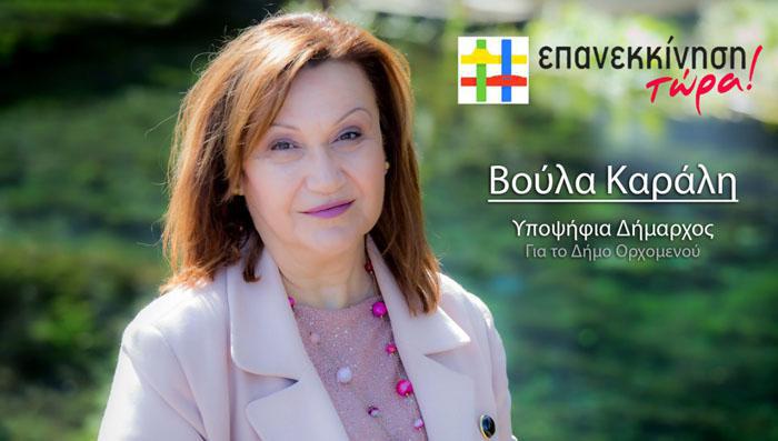 Στο Δήμο Ορχομενού, η οδοντίατρος κ. Παρασκευή Καράλη αποτελεί την πρώτη γυναίκα που αναλαμβάνει καθήκοντα Δημάρχου. Η κ. Καράλη έχει εκλεγεί δύο φορές Δημοτική Σύμβουλος, ενώ έχει τελέσει Αντιδήμαρχος Πολιτισμού και Υπεύθυνη για την αναγέννηση της Δημοτικής Βιβλιοθήκης Ορχομενού.