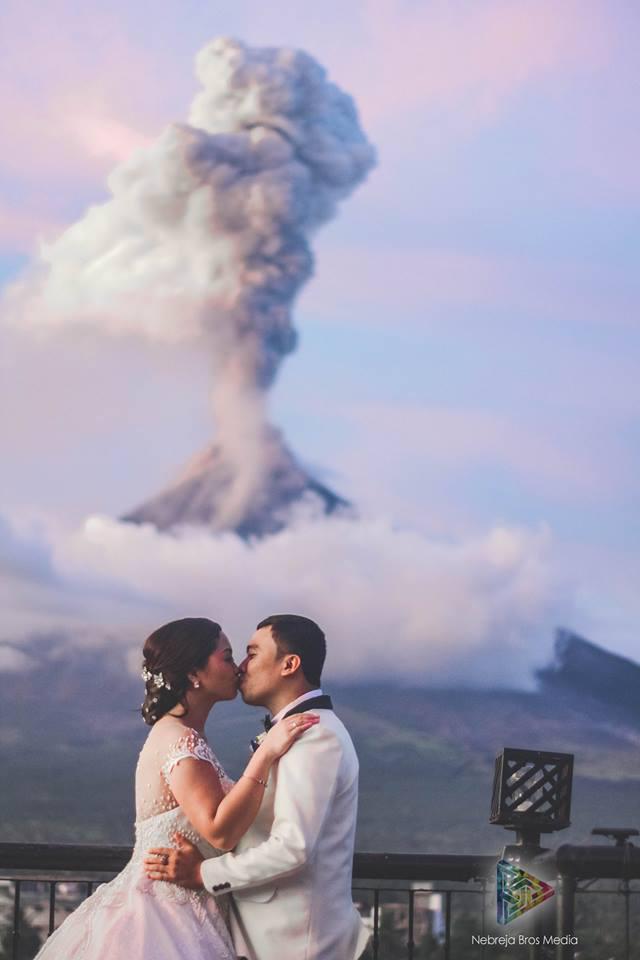 Η Μαρία Χούσα Μάικα Νισέιρο και ο Άρλο Τζέραλντ ντε λα Κρους στιγμή δεν δίστασαν. Ορκίστηκαν ο ένας στον άλλο αιώνια αγάπη και παντρεύτηκαν με φόντο το θυμωμένο όρος Μαγιόν, το πιο ενεργό ηφαίστειο στις Φιλιππίνες (έχει εκραγεί 50 φορές τα τελευταία 500 χρόνια).