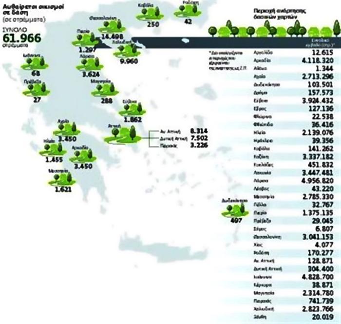 Συνολικά, βάσει των στοιχείων που παρείχαν οι περισσότεροι δήμοι στις 33 περιοχές όπου έγινε ανάρτηση δασικών χαρτών προκύπτει ότι οι οικιστικές πυκνώσεις καλύπτουν συνολικά περί τα 62.000 στρέμματα. Ωστόσο, από τους 120 δήμους που έπρεπε να στείλουν στην ΕΚΧΑ (Εθνικό Κτηματολόγιο και Χαρτογράφηση) αποτυπωμένες τις οικιστικές πυκνώσεις που υπάρχουν στην περιοχή τους, λείπουν οι εννιά. Σε αυτούς περιλαμβάνονται, όλως περιέργως, δήμοι με περιοχές-φιλέτα, όπως της Μυκόνου, της Σιθωνίας Χαλκιδικής και της Πύλου Νέστορος στη Μεσσηνία.