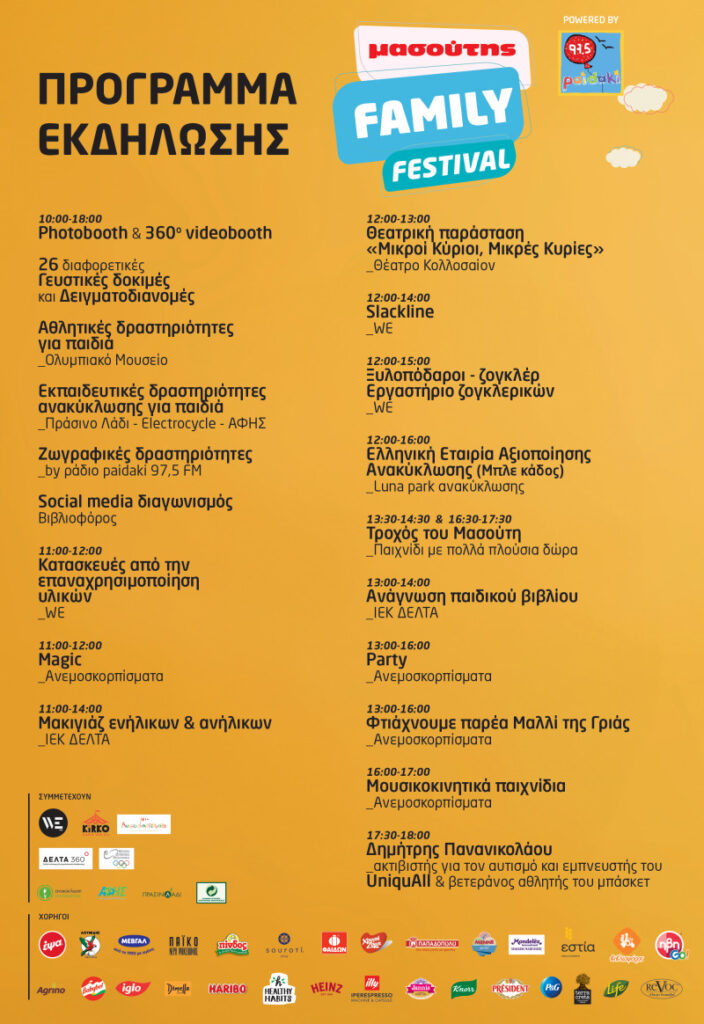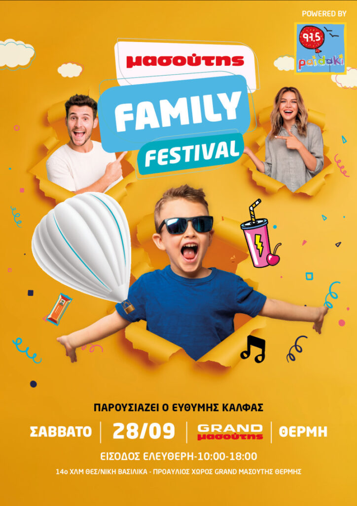 Τα σούπερ μάρκετ Μασούτης γιορτάζουν 48 χρόνια επιτυχημένης πορείας στην ελληνική αγορά και διοργανώνουν το 1ο Masoutis Family Festival powered by Paidaki 97.5 FM, το Σάββατο 28 Σεπτεμβρίου 2024, από τις 10πμ έως τις 6.00μμ, στον εξωτερικό χώρο του Grand Μασούτης στη Θέρμη.