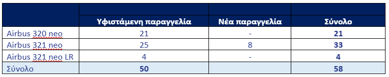 Μέχρι σήμερα έχουν ήδη παραληφθεί 34 αεροσκάφη της οικογένειας Airbus 320/321 neo και με τη νέα παραγγελία θα παραληφθούν άλλα 24 αεροσκάφη. Για το 2025, η AEGEAN έχει ήδη παραλάβει ένα (1) αεροσκάφος Α320 neo και προγραμματίζει να παραλάβει άλλα τέσσερα (4) νέα αεροσκάφη της οικογένειας A320 neo.